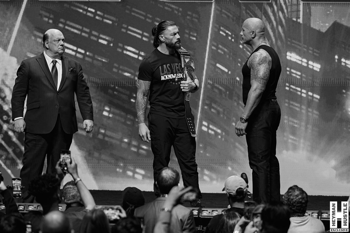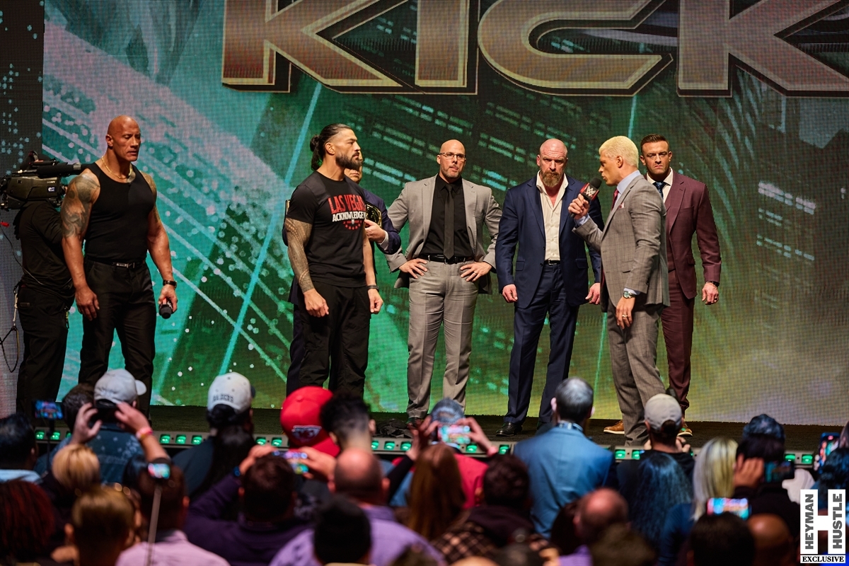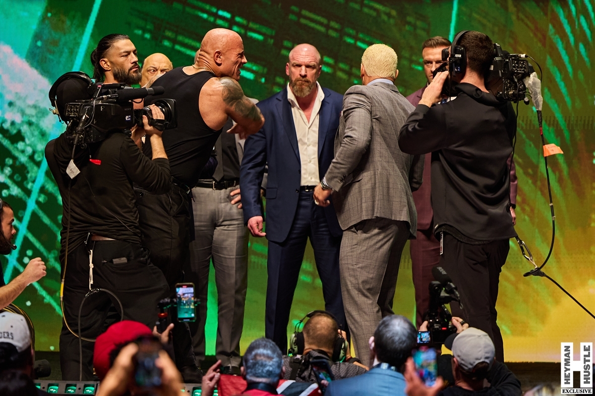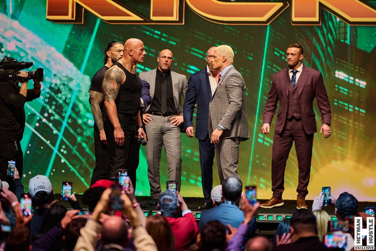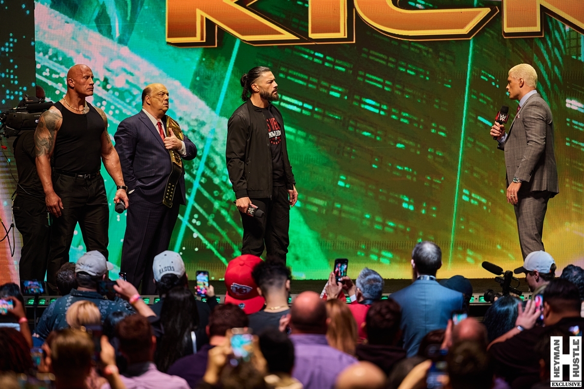 The Rock slaps Cody Rhodes. Undisputed WWE Universal Heavyweight Champion Roman Reigns (along with our boss, his #SpecialCounsel and #Wiseman Paul Heyman) confronted WWE World Champion Seth Rollins, announced he would fight Rock at WrestleMania, only for Cody Rhodes to declare his right to challenge for the title. Oh, it was quite a wild WrestleMania Kickoff Event in Las Vegas, and The Heyman Hustle dispatched Alan Sabido to provide full 360 coverage just for you!
