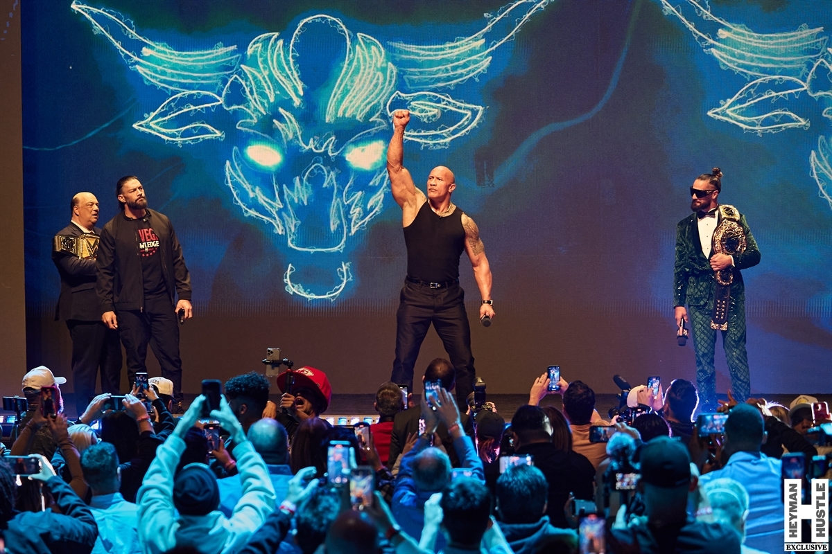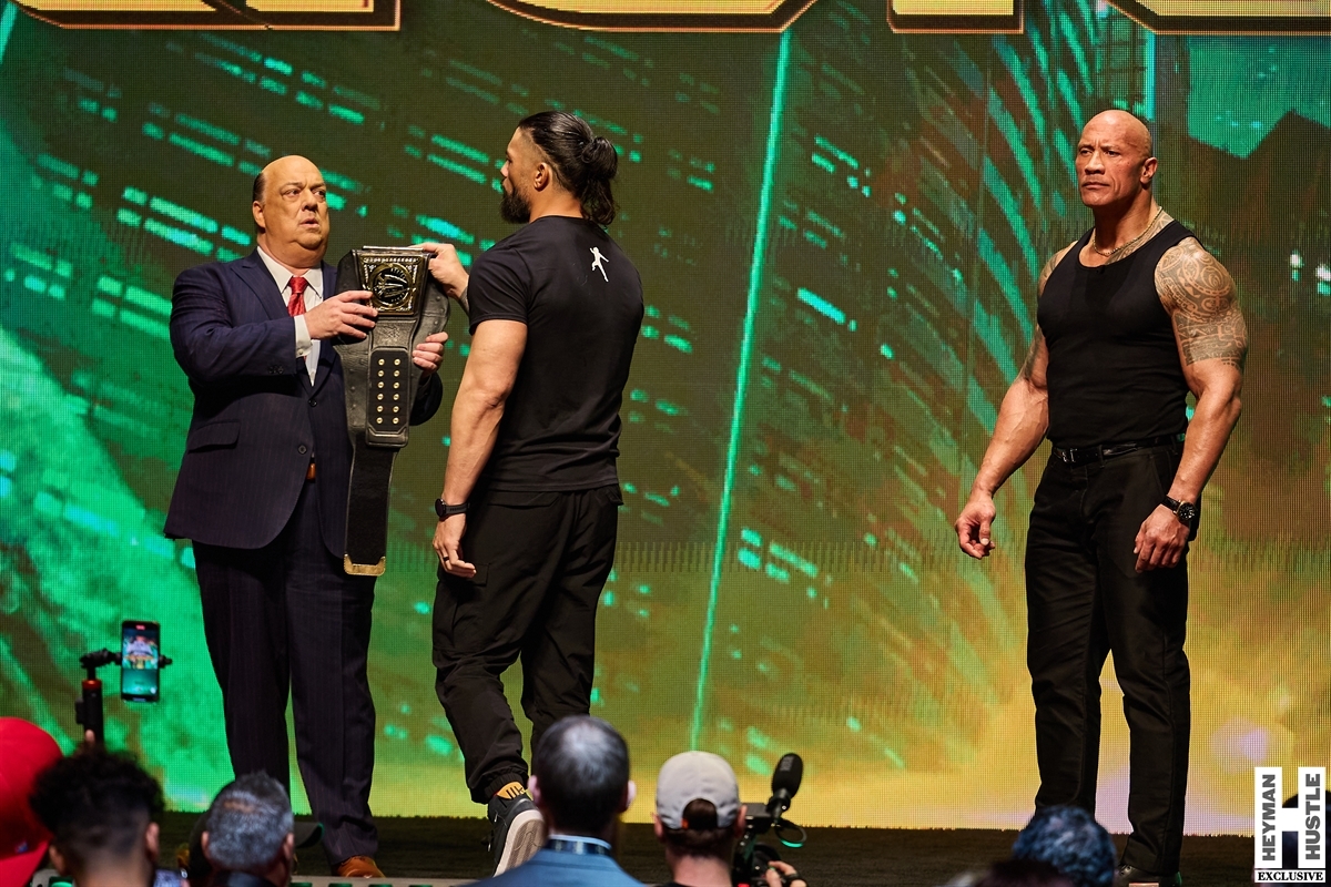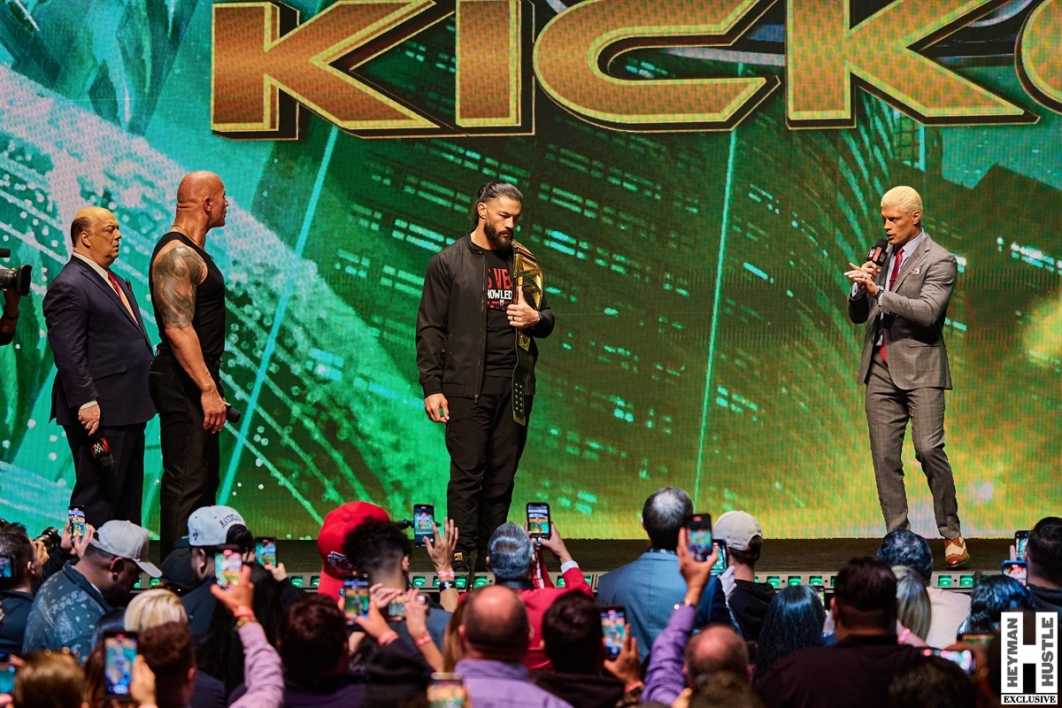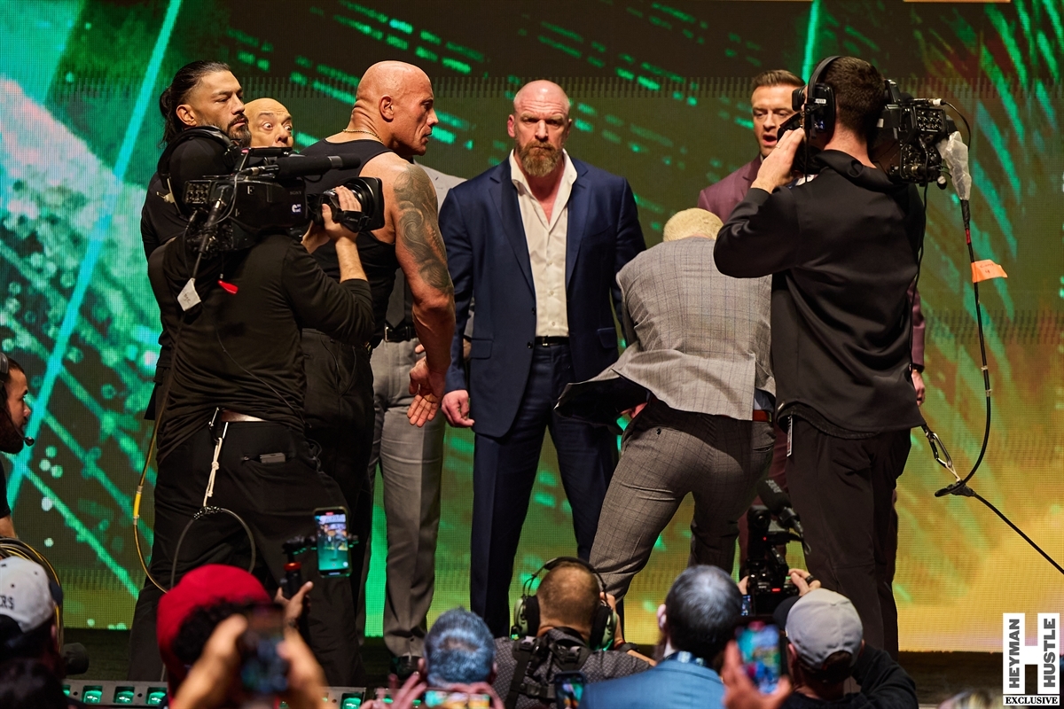 The Rock slaps Cody Rhodes. Undisputed WWE Universal Heavyweight Champion Roman Reigns (along with our boss, his #SpecialCounsel and #Wiseman Paul Heyman) confronted WWE World Champion Seth Rollins, announced he would fight Rock at WrestleMania, only for Cody Rhodes to declare his right to challenge for the title. Oh, it was quite a wild WrestleMania Kickoff Event in Las Vegas, and The Heyman Hustle dispatched Alan Sabido to provide full 360 coverage just for you!