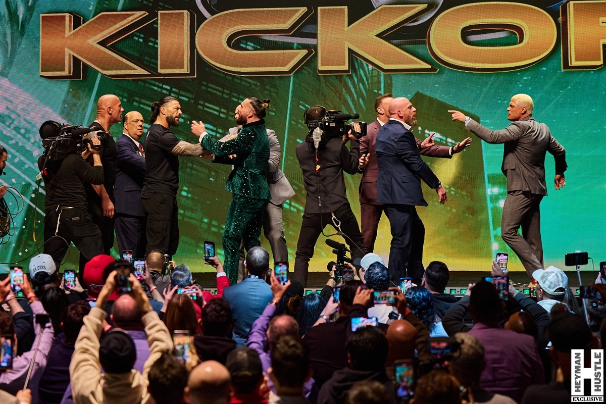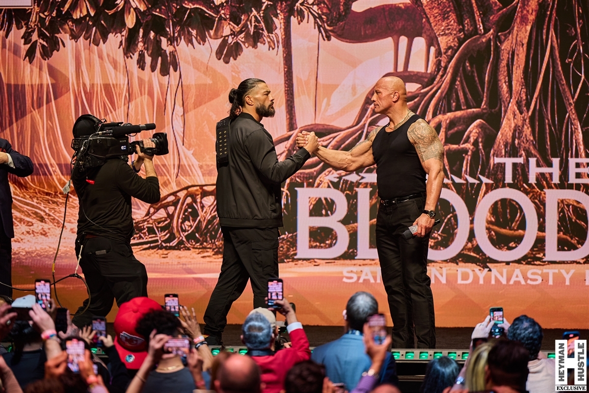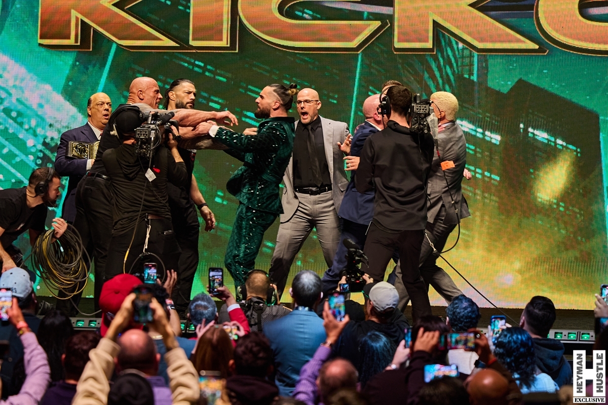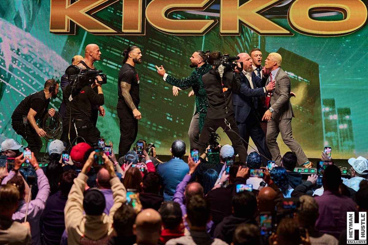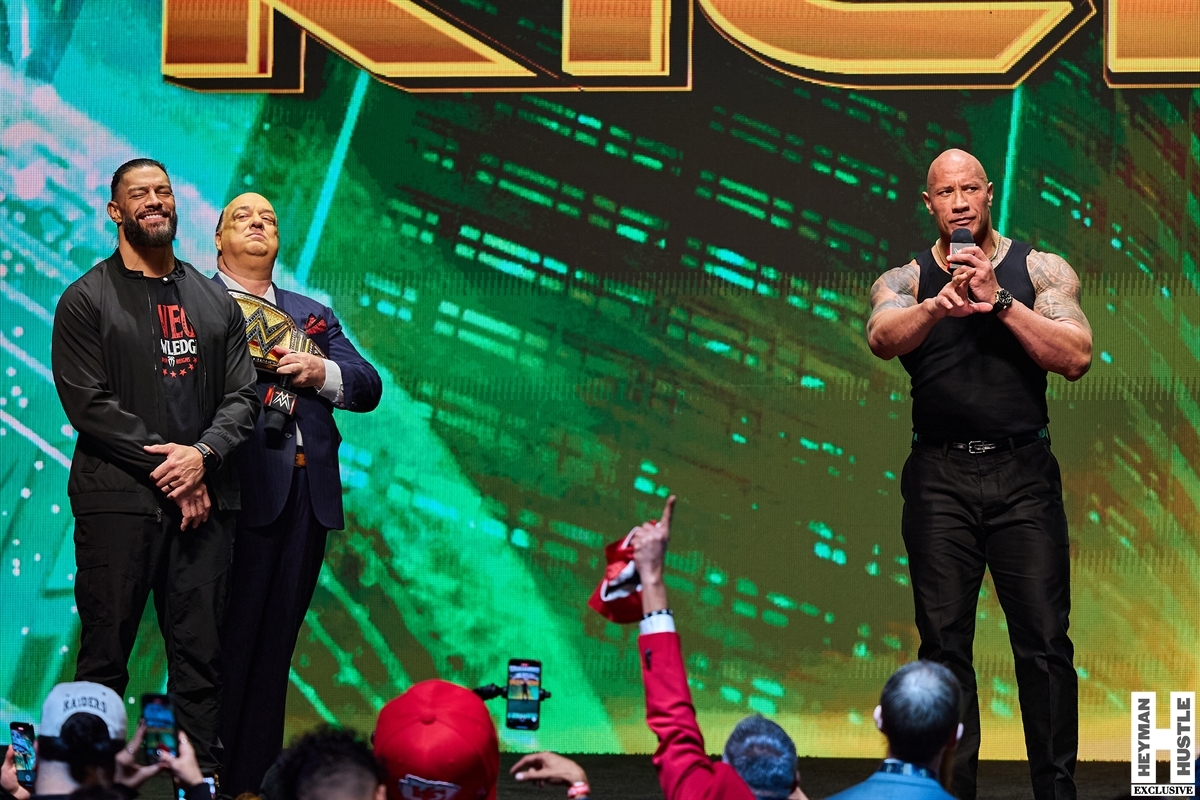 The Rock slaps Cody Rhodes. Undisputed WWE Universal Heavyweight Champion Roman Reigns (along with our boss, his #SpecialCounsel and #Wiseman Paul Heyman) confronted WWE World Champion Seth Rollins, announced he would fight Rock at WrestleMania, only for Cody Rhodes to declare his right to challenge for the title. Oh, it was quite a wild WrestleMania Kickoff Event in Las Vegas, and The Heyman Hustle dispatched Alan Sabido to provide full 360 coverage just for you!