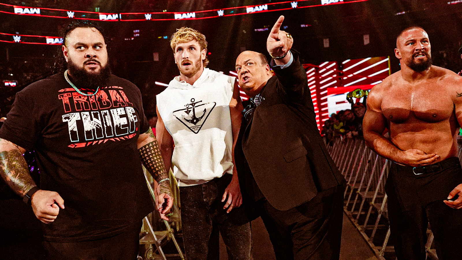 Logan Paul certainly shocked everyone (especially CM Punk) when he cracked Punk with brass knuckles in the closing moments of last week’s WWE Monday Night RAW live on Netflix. Tonight, Logan Paul took it even further when he came out (at the demand of CM Punk himself) and then was flanked by The Vision‘s Paul Heyman, Bronson Reed and Bron Breakker.