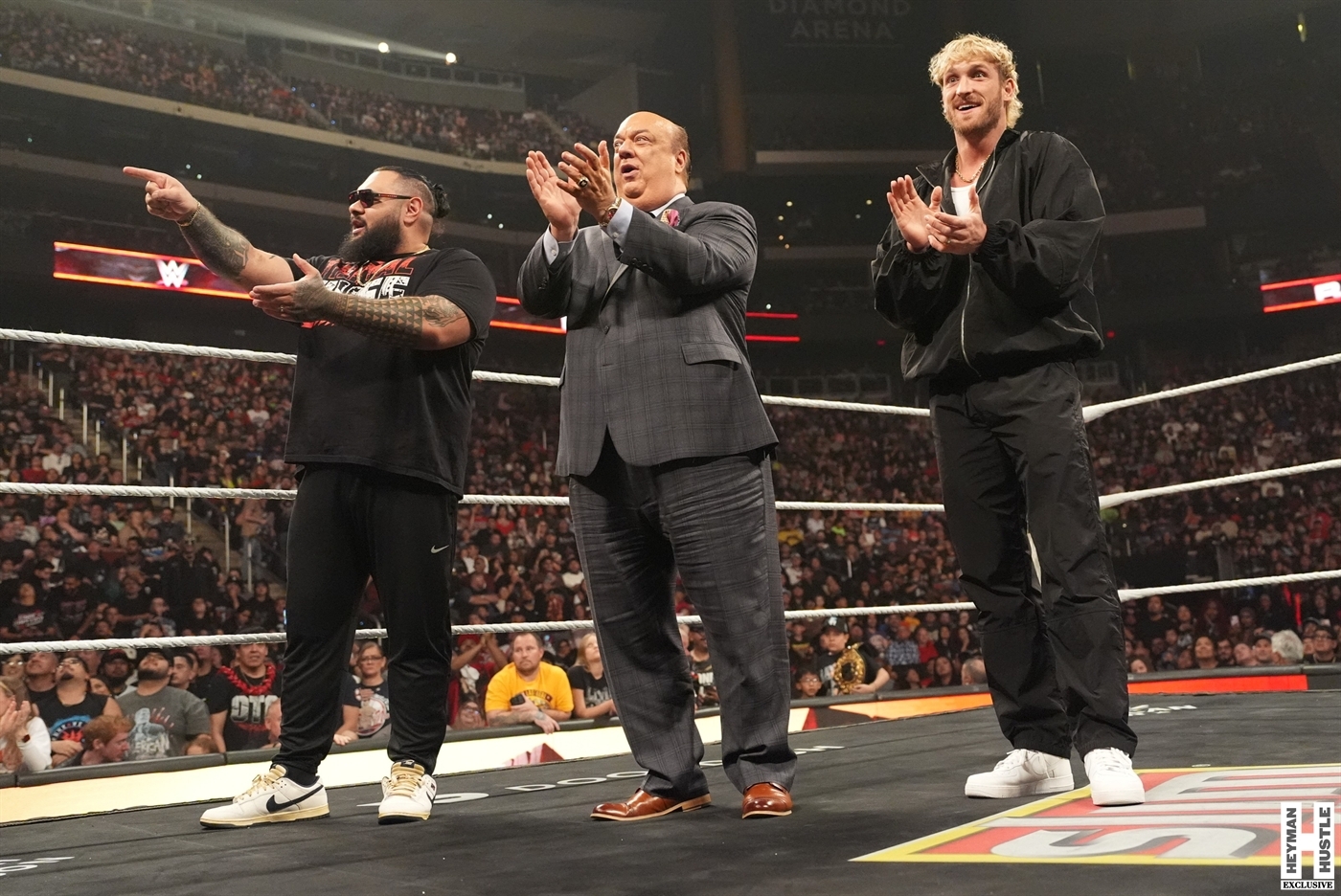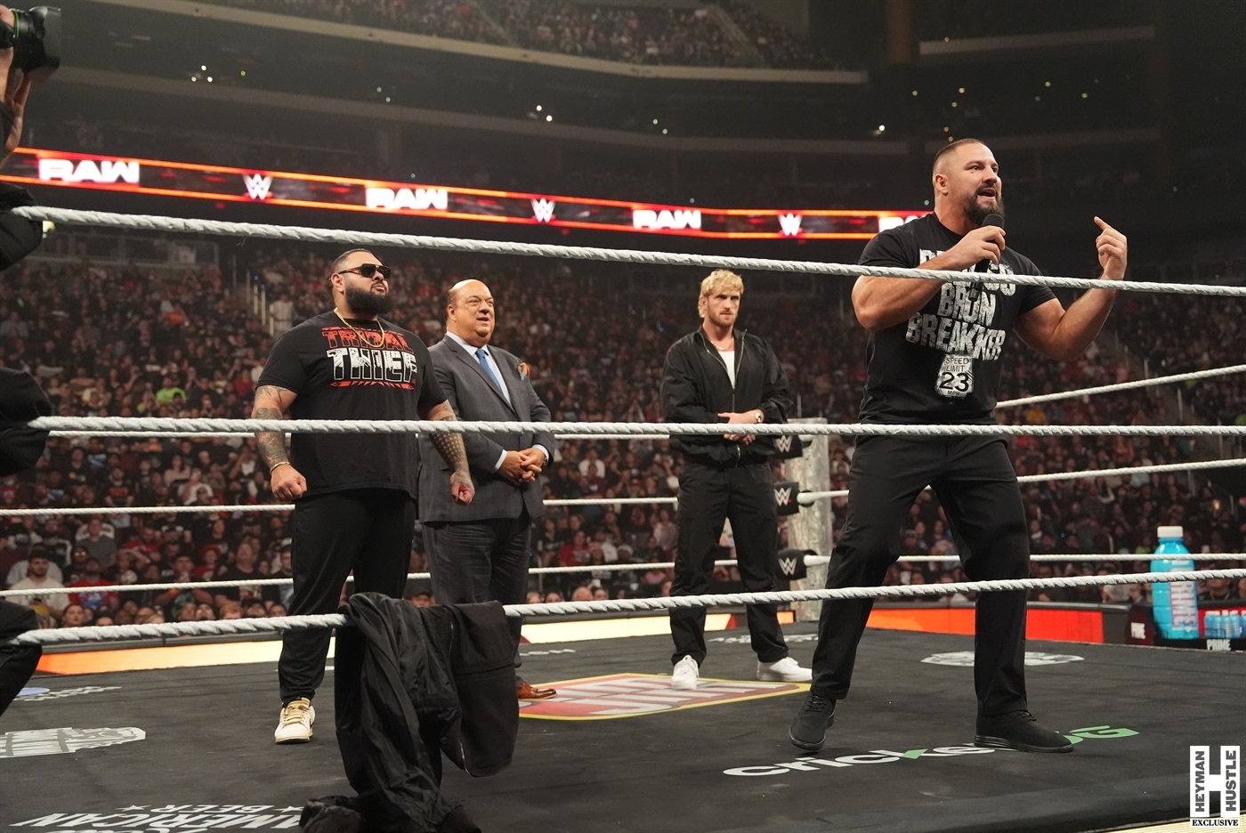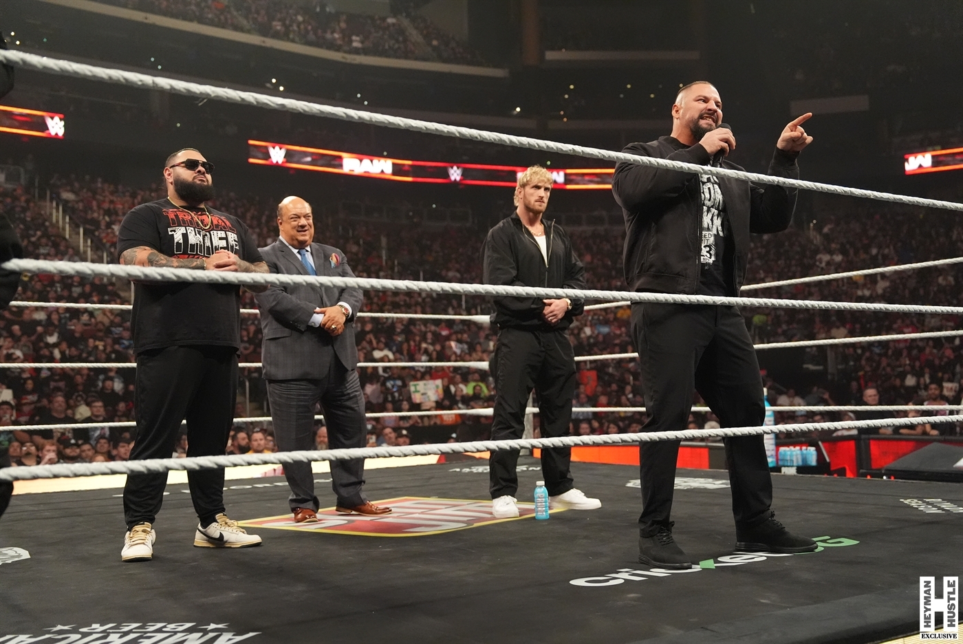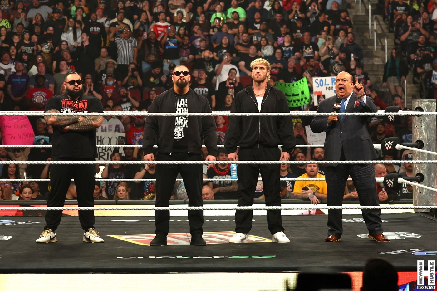 In the aftermath of their contentious victory at WWE Survivor Series: WarGames, our boss, Paul Heyman strode to the ring on Monday Night RAW, flanked by The Vision‘s powerhouse duo of Bron Breakker and Bronson Reed, along with their newest ally, Logan Paul, all basking in the glow of victory secured by a mysterious masked interferer’s aid. Heyman proclaimed that Breakker, the ferocious spearhead of their War Games dominance, had rightfully earned a shot at CM Punk‘s World Heavyweight Championship.
