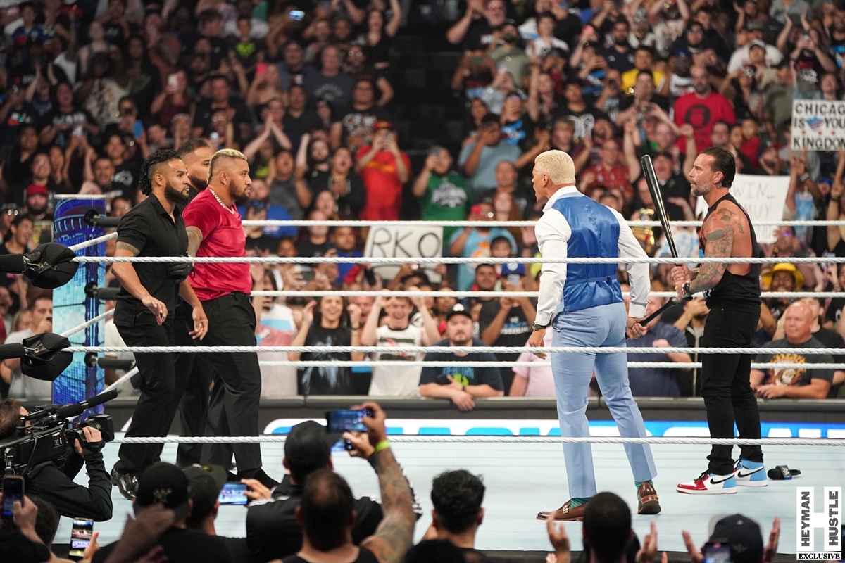 “Ladies and Gentlemen,” a shocking (and crowd-pleasing) interruption from our boss, Paul Heyman, who reunited with Punk in front of the entire world, in an emotional moment to be further interrupted, this time by Solo Sikoa, The Right Hand Man Tama Tonga and The Infamous Tonga Loa.