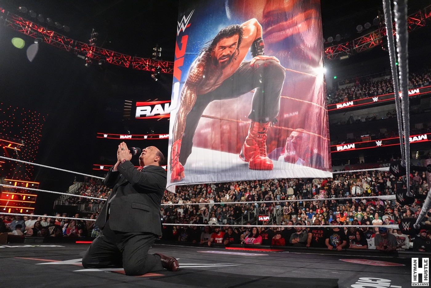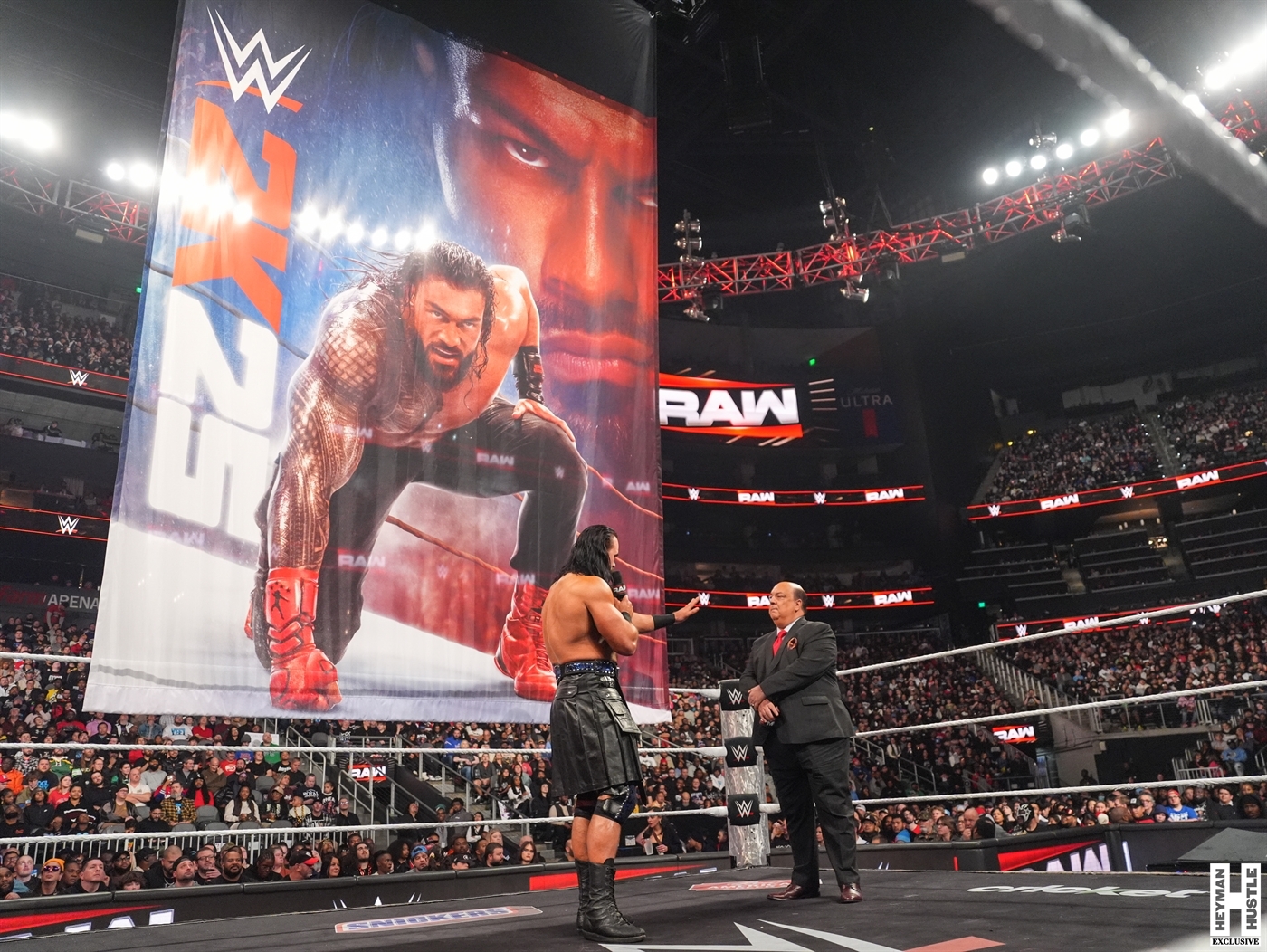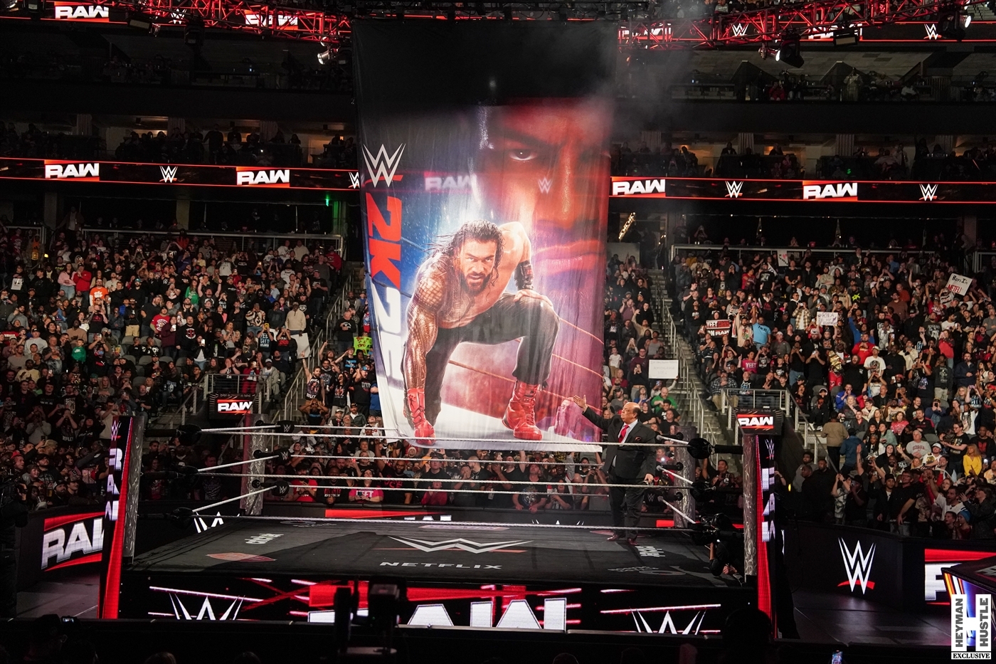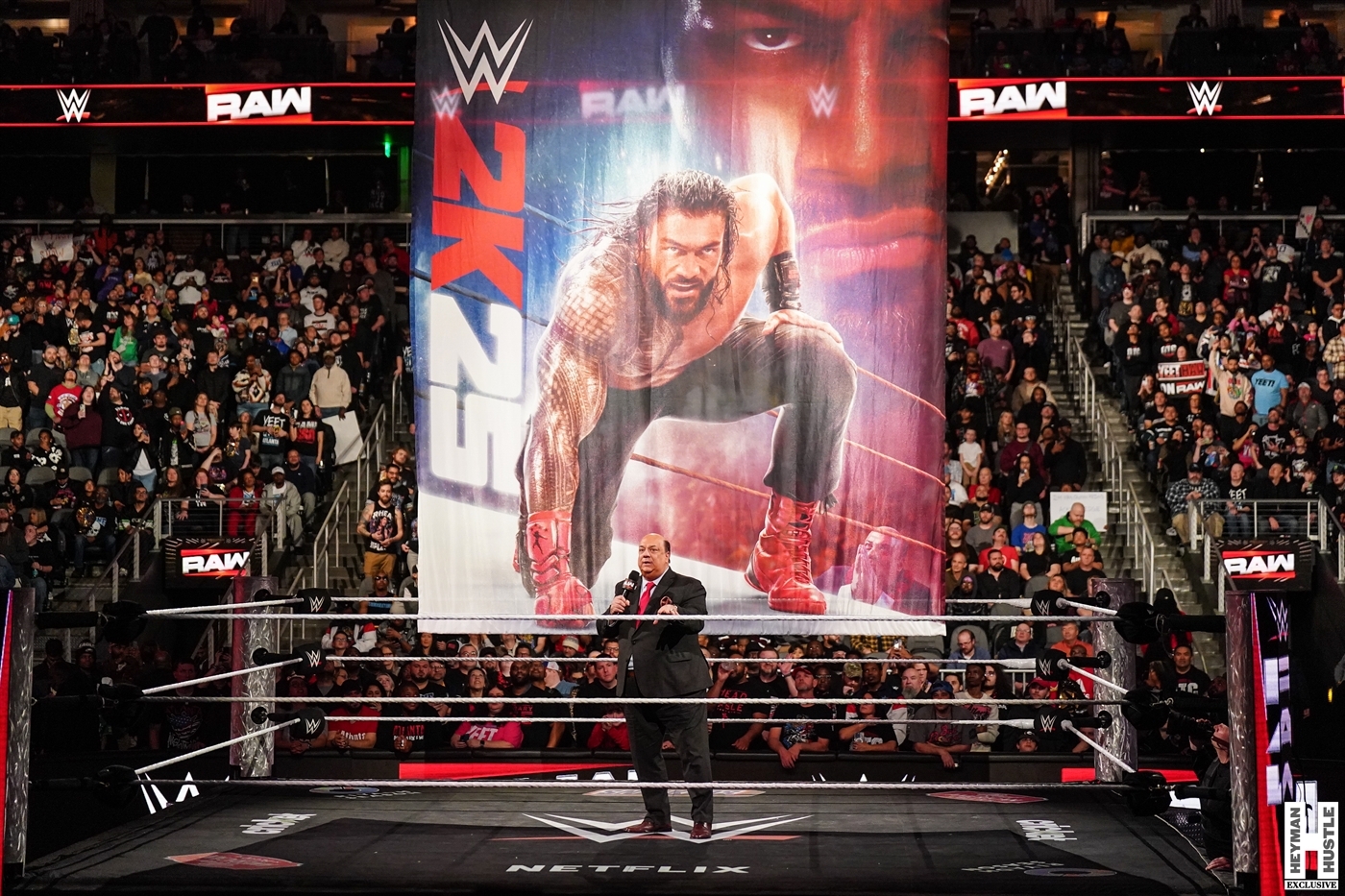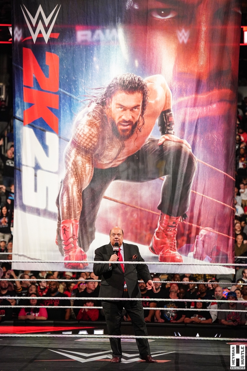 Our boss, “The Wiseman” Paul Heyman made a surprise appearance on WWE Monday Night RAW live on Netflix to reveal the cover art for #WWE2K25, which features “The Tribal Chief” Roman Reigns. The Heyman Hustle had multiple photographers in place for this historic moment for both WWE and 2K, only to see yet another surprise take place when Drew McIntyre took it upon himself to come out to the ring and discuss his vision for this Saturday’s WWE Royal Rumble.