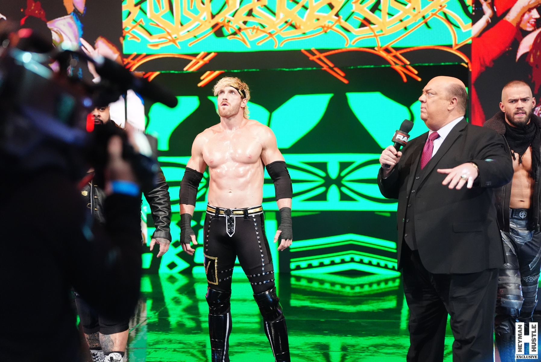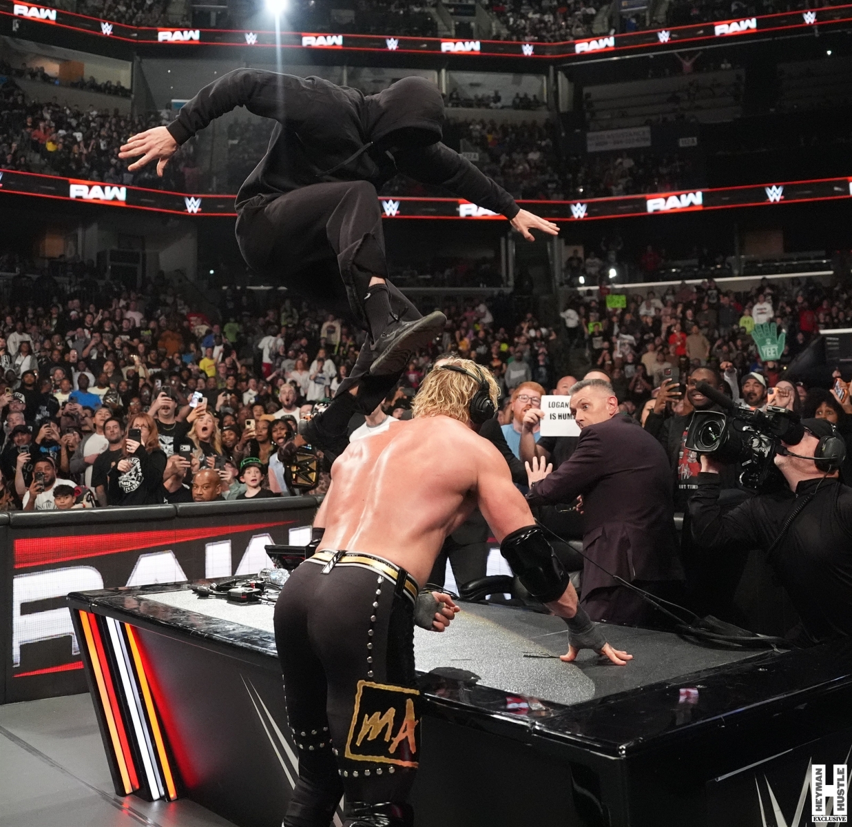 The Vision (Logan Paul – Bronson Reed – Austin Theory, accompanied by our boss Paul Heyman) scored a major victory over LA Knight and The Usos after The Vision interrupted The Usos’ Yeet Party to kick off WWE Monday Night RAW live on Netflix. But after the victory, Logan Paul was bragging and boasting at the announce desk when the Mystery Masked Man struck yet again with a Stomp!