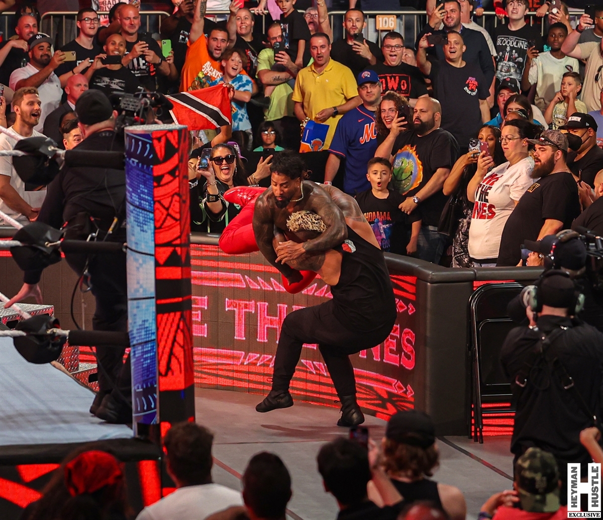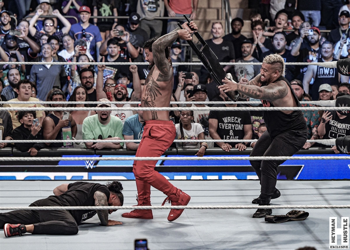 And now, continuing his coverage, the Hustle’s very own George Tahinos has filed these photos as his exclusive coverage of the events that took place at the end of the show, one side of the Bloodline (Reigns, Paul Heyman and Solo) is at Civil War against the other (The Usos).
