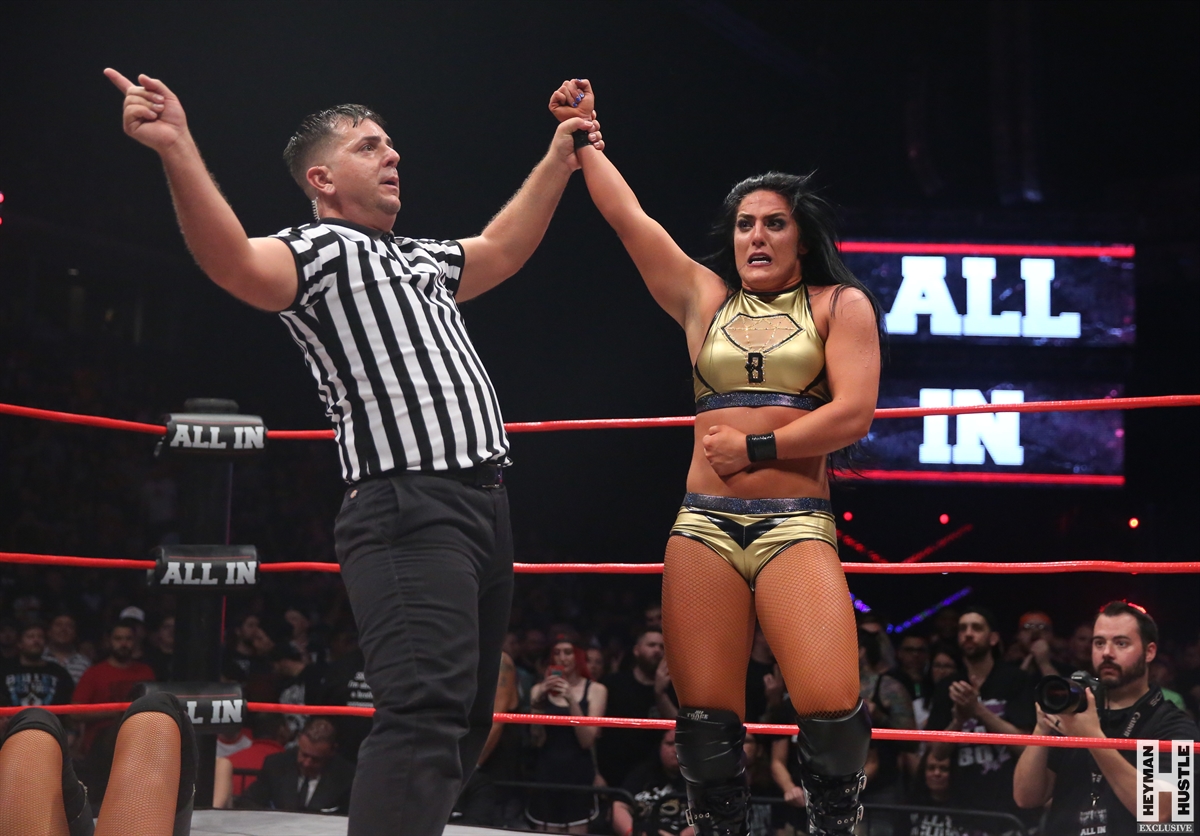 The All-In mega-event has the entire city of Chicago buzzing tonight, as people flew in from around the world to witness a truly historic night of professional wrestling and sports entertainment put on by Cody Rhodes and The Young Bucks. Photographer Bruno Silveira was on hand to provide EXCLUSIVE coverage for The Heyman Hustle, and we are proud to present his Hustle Photo Book on Tessa Blanchard‘s enormous victory in the stellar fatal four-way match against Madison Rayne, Britt Baker and Chelsea Green.