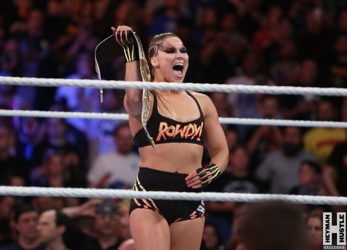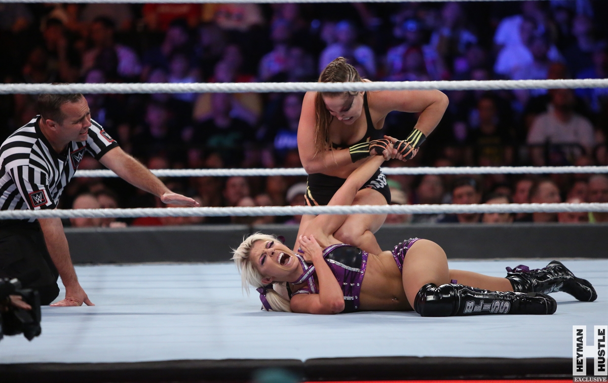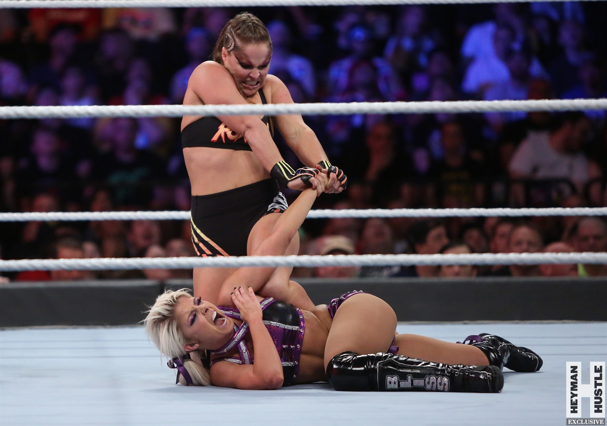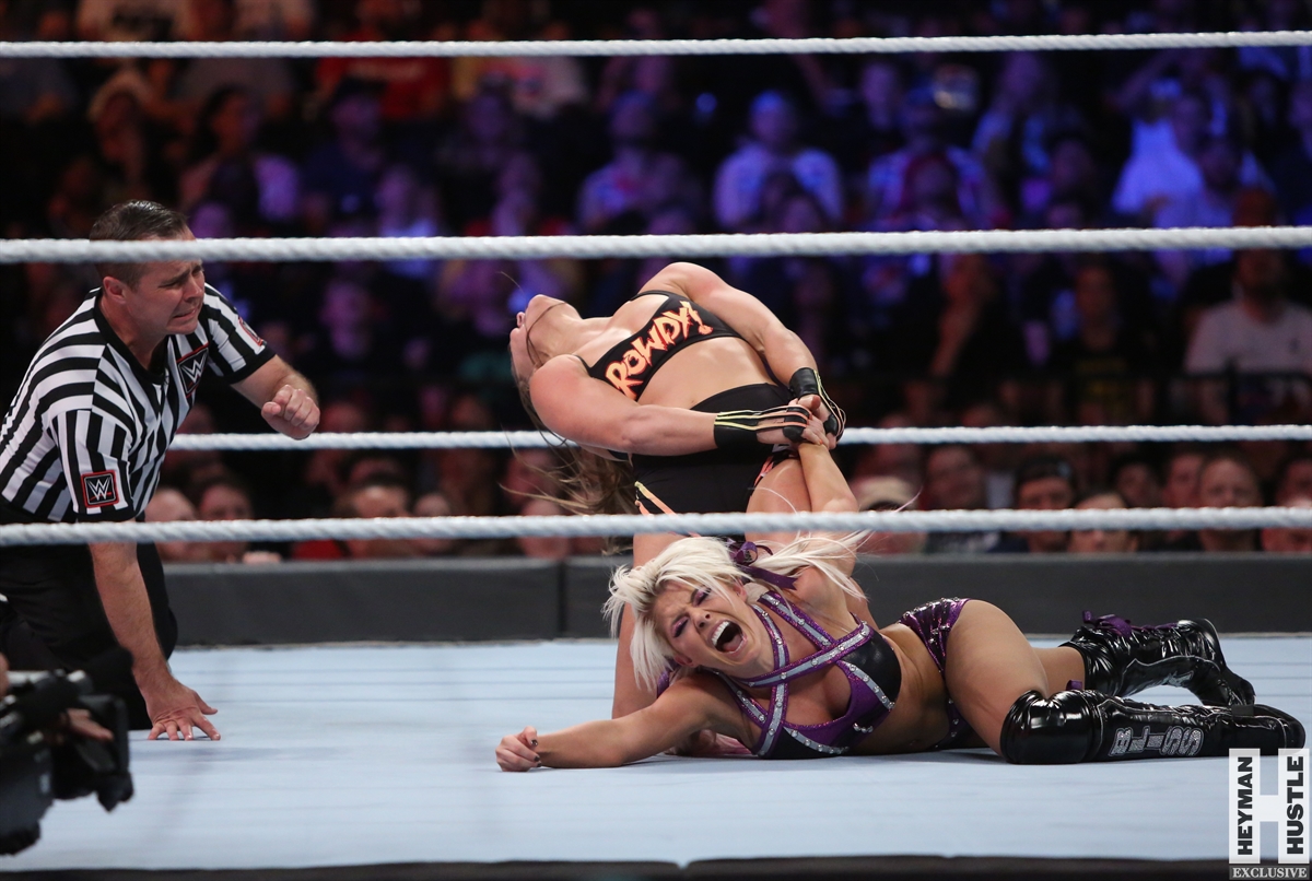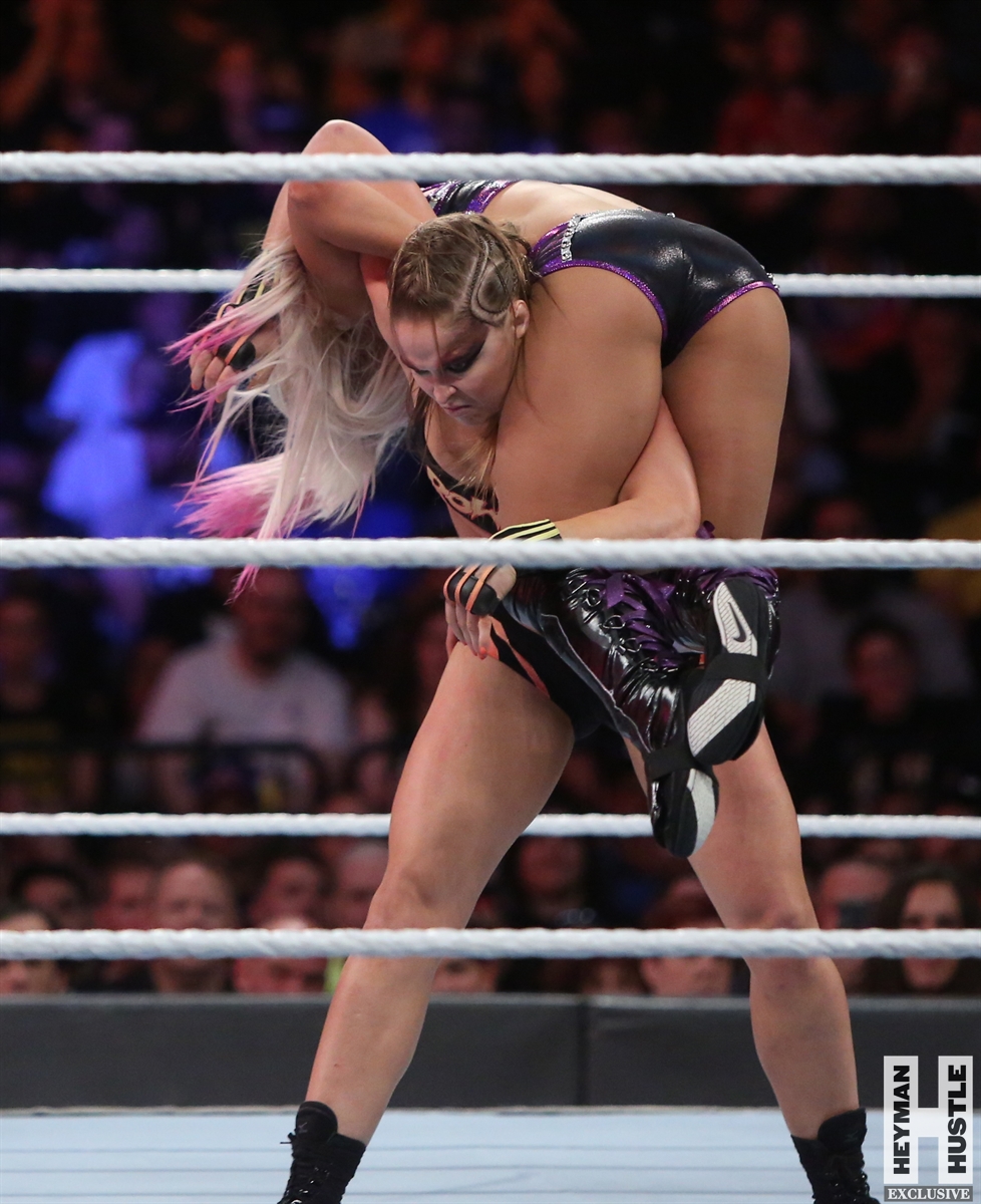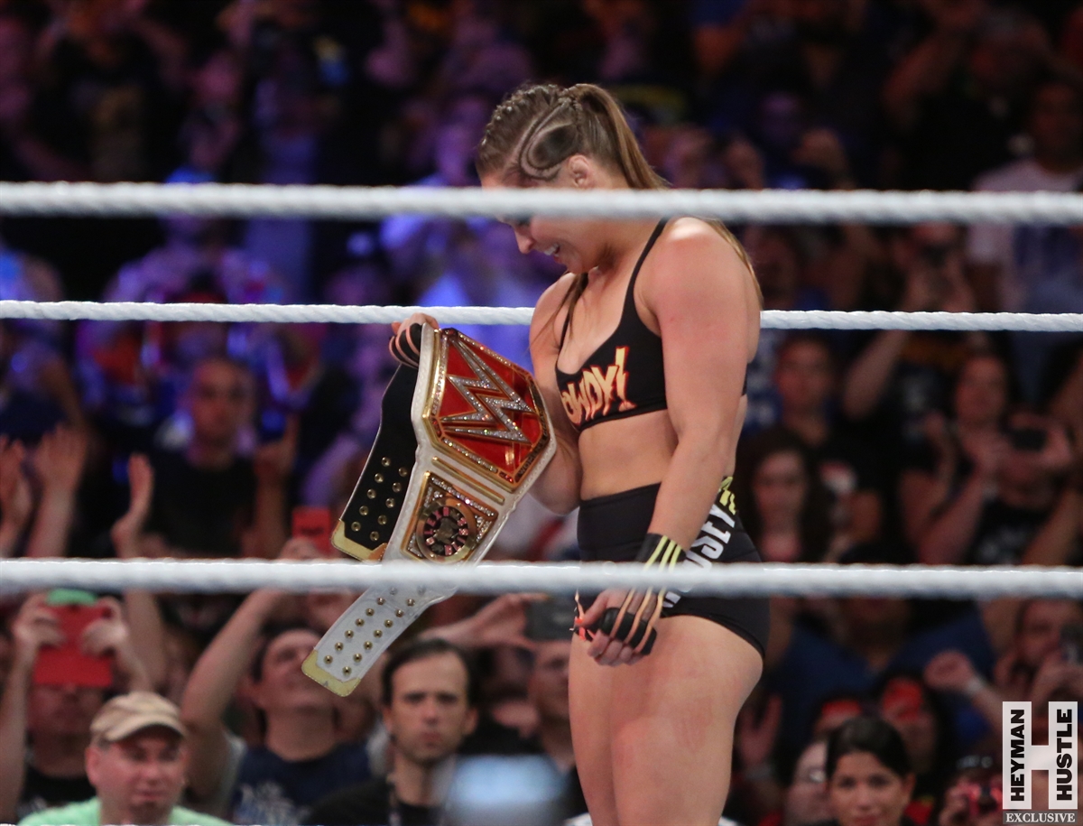 Rowdy Ronda Rousey made history at WWE SummerSlam, which took place earlier this evening at the Barclays Center in Brooklyn, New York, when she tapped out Alexa Bliss with an arm bar, becoming the Raw Women’s Champion and the first woman in history to hold championships in both UFC and WWE.