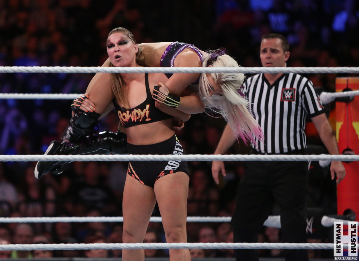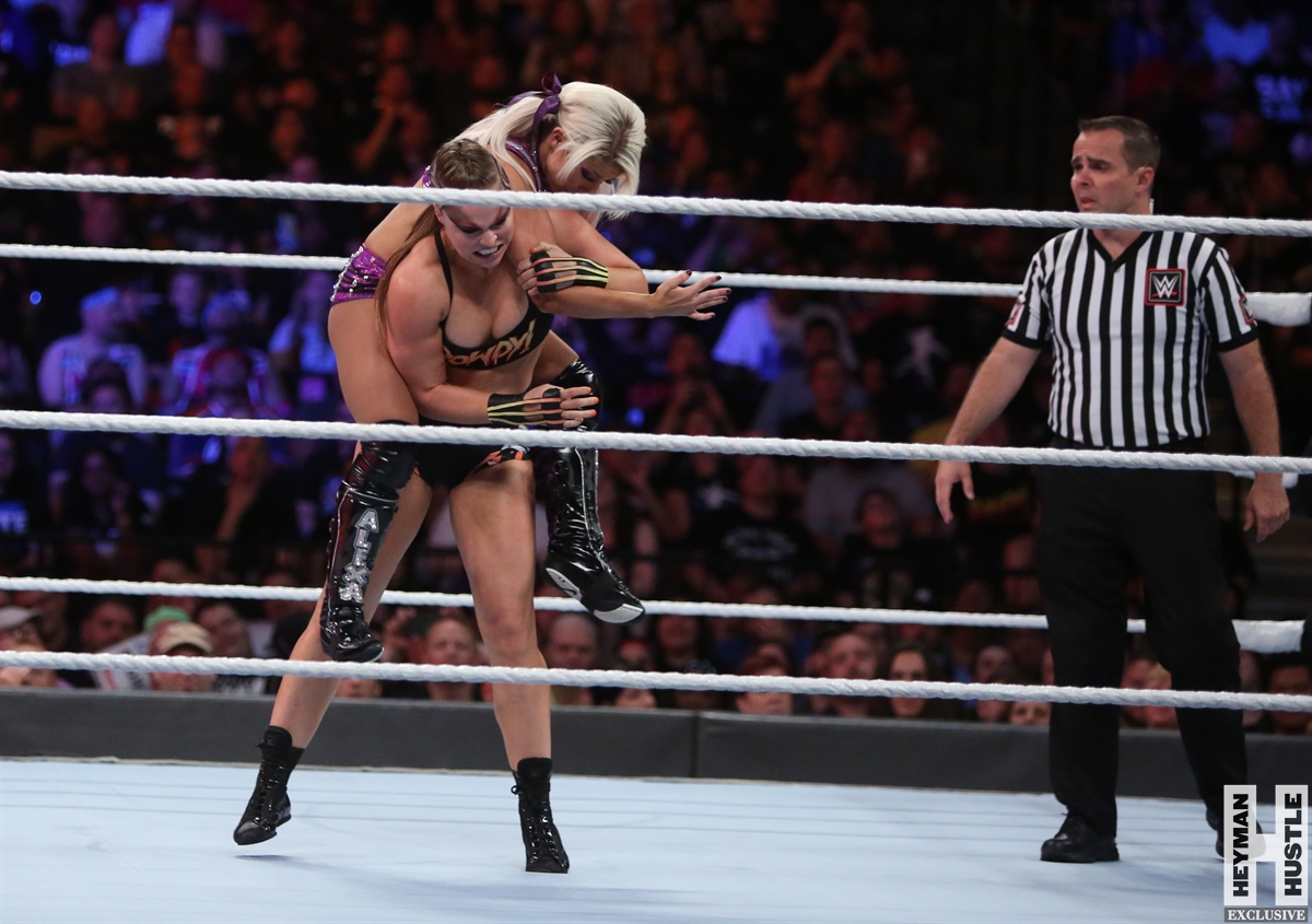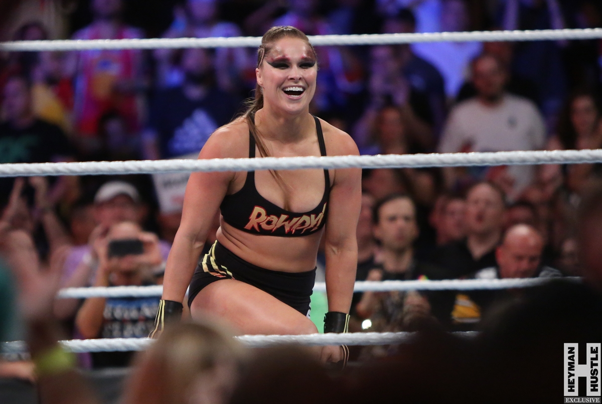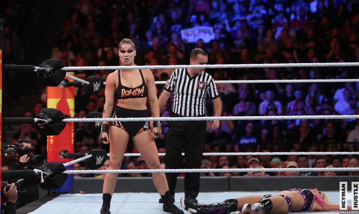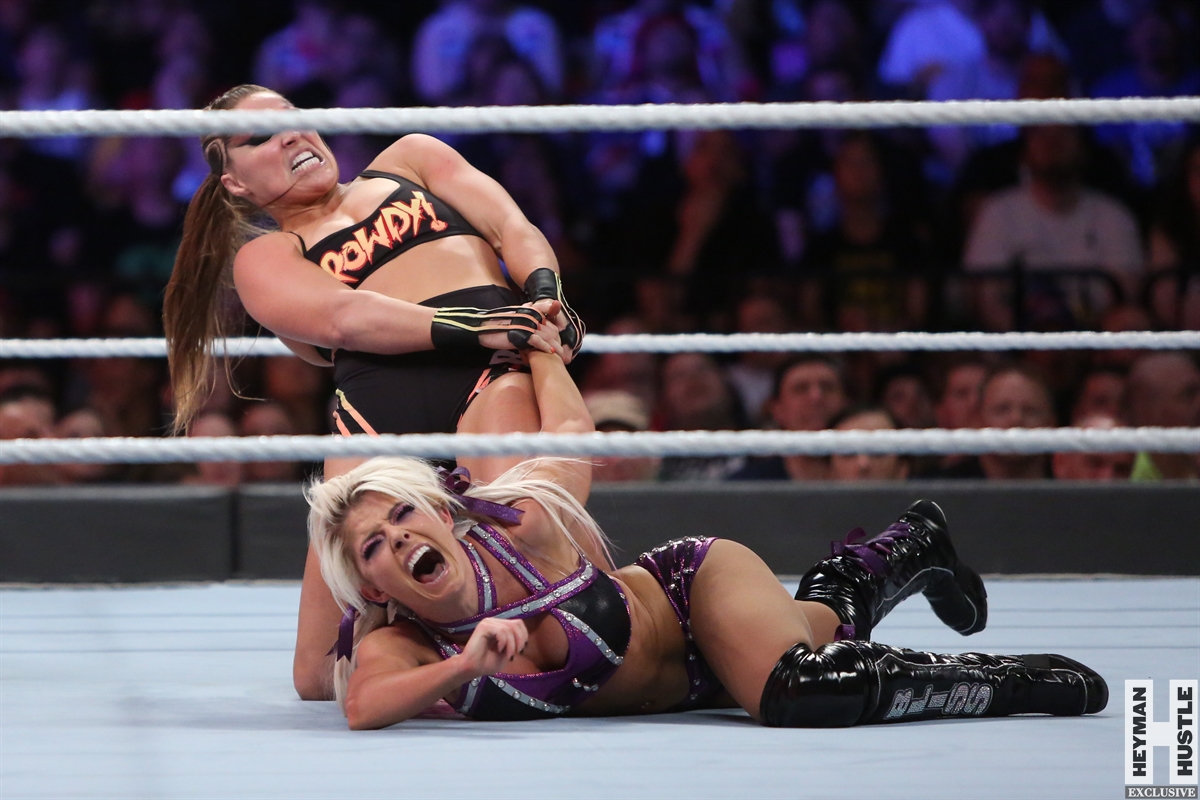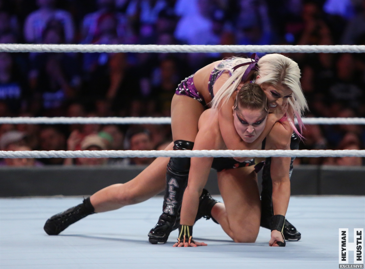 Rowdy Ronda Rousey made history at WWE SummerSlam, which took place earlier this evening at the Barclays Center in Brooklyn, New York, when she tapped out Alexa Bliss with an arm bar, becoming the Raw Women’s Champion and the first woman in history to hold championships in both UFC and WWE.