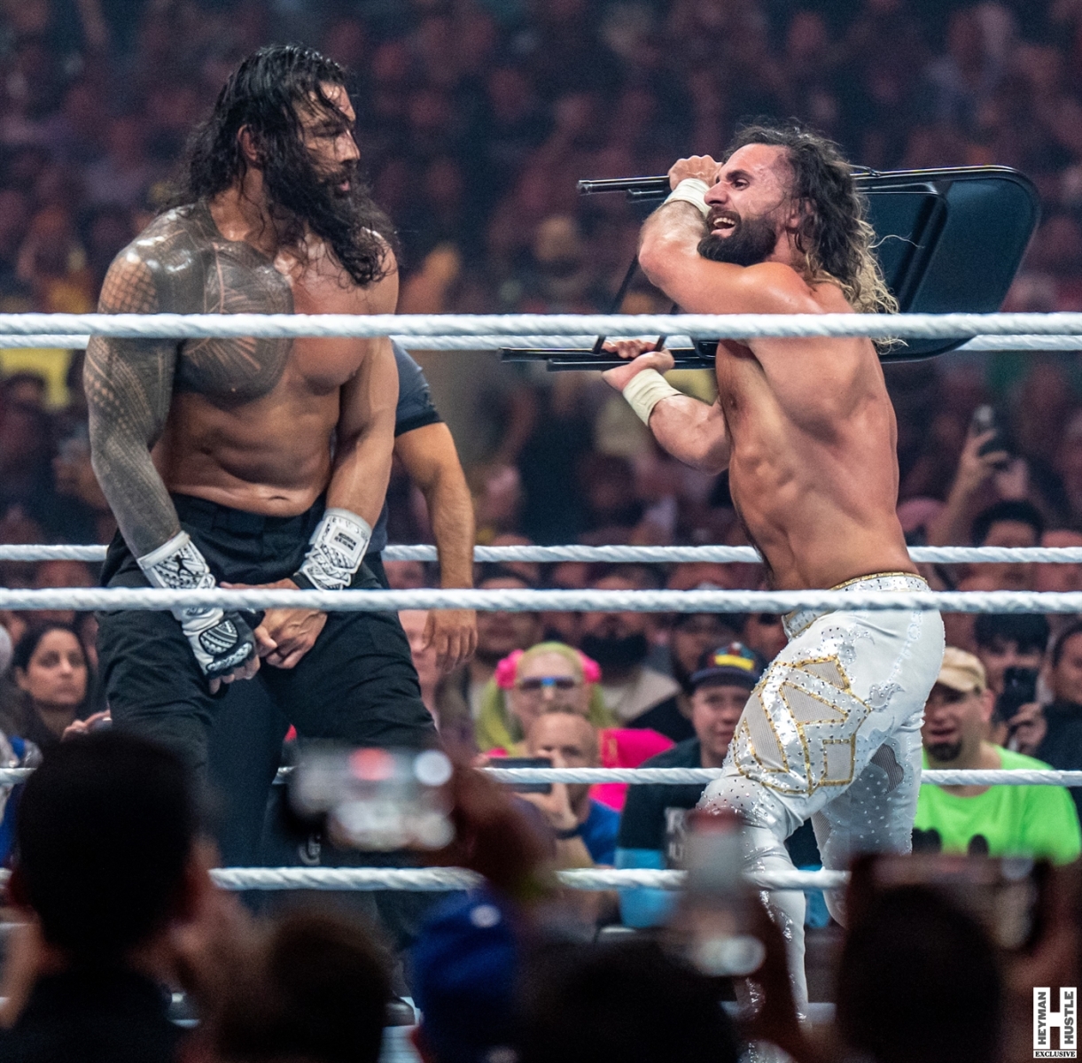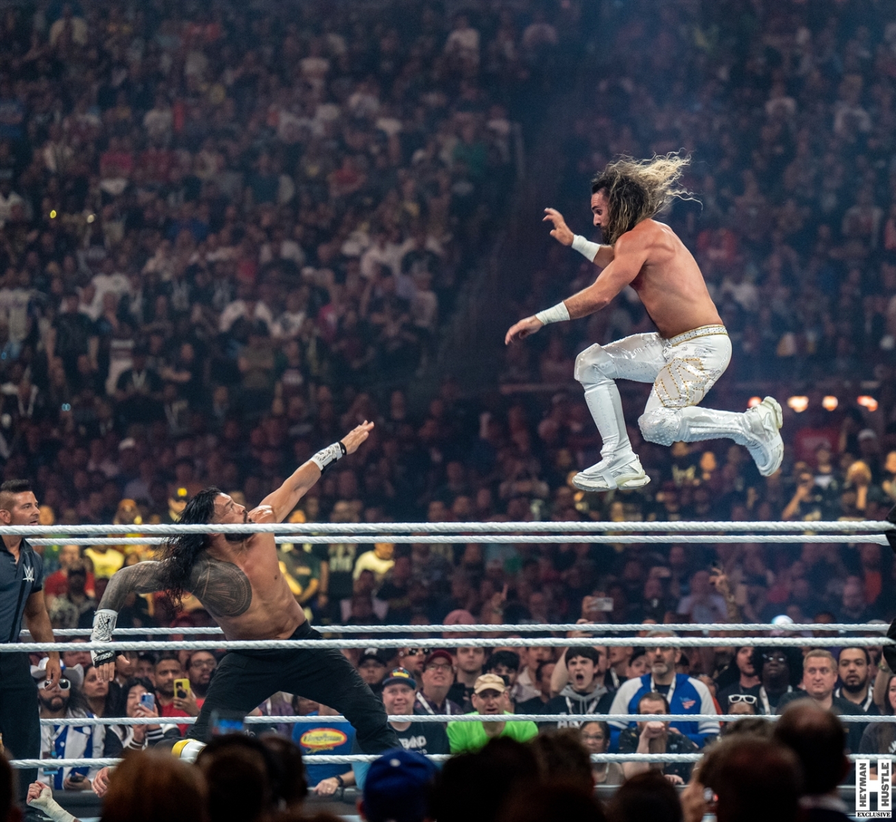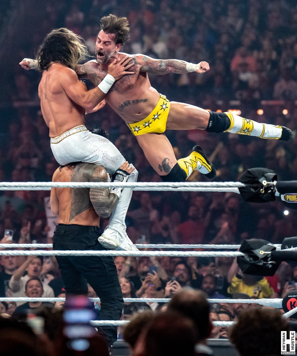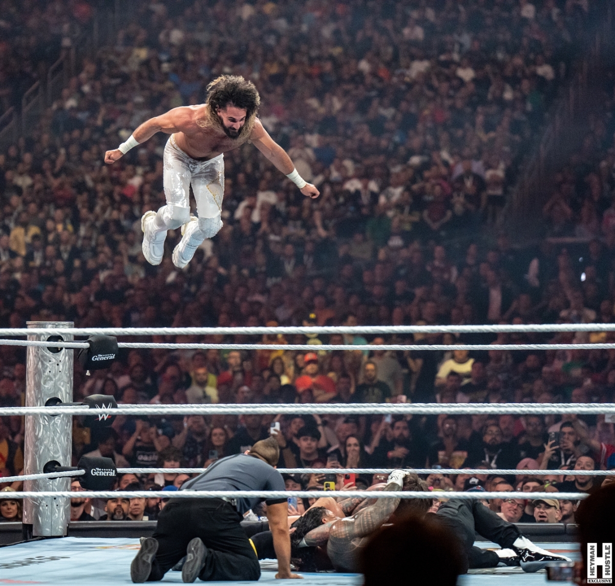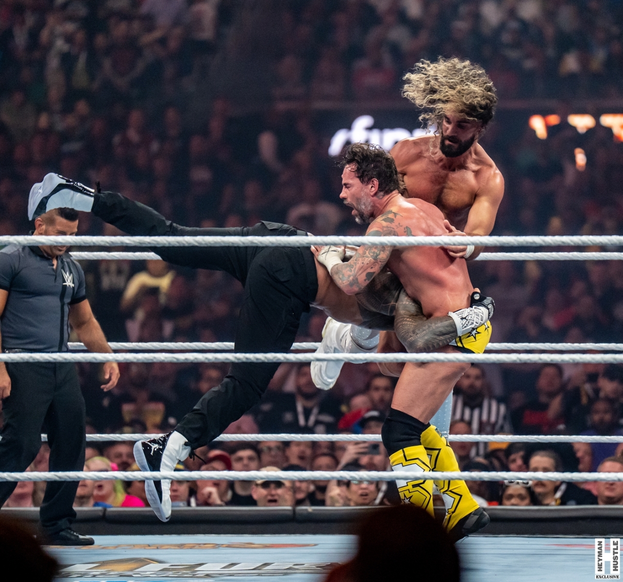 Kimberlasskick was in Las Vegas to provide 360 coverage of WrestleMania 41 just for you, and here are her exclusive photos of the main event of Night 1 for WrestleMania 41. The match, a Triple Threat Match featured “The Tribal Chief” Roman Reigns vs former Shield partner Seth Freakin’ Rollins vs “The Best in the World” CM Punk who controversially had Reigns’ Wiseman (our boss) Paul Heyman in his corner as The Favor that was owed to Punk for bailing out The OG Bloodline at Survivor Series!