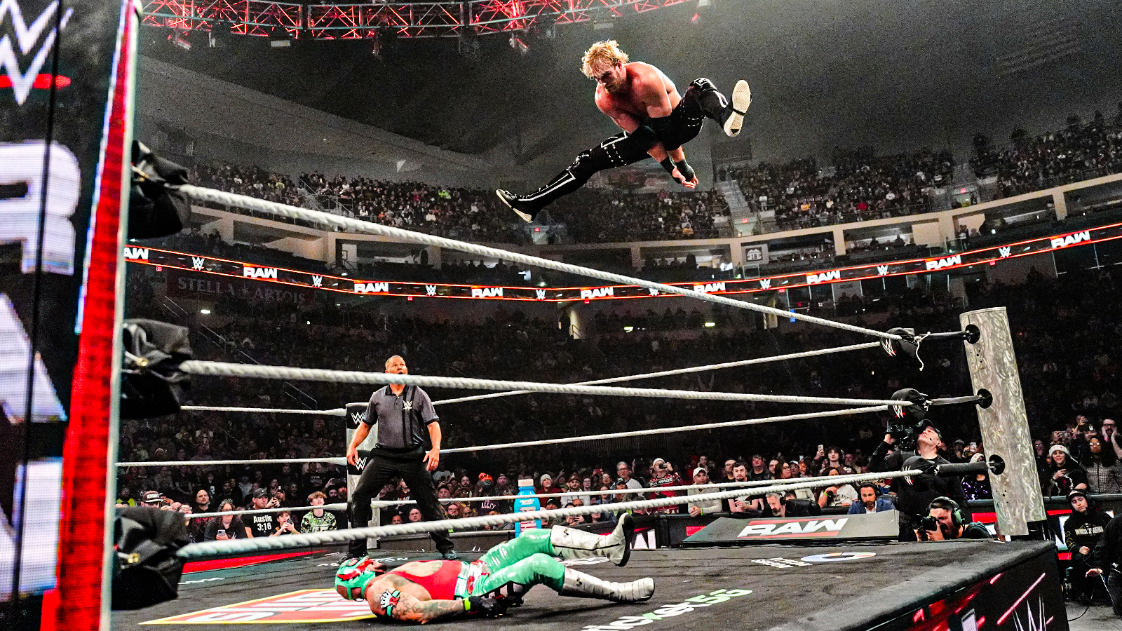 Logan Paul (accompanied by our boss, Paul Heyman on behalf of The Vision) defeated Rey Mysterio in the main event of this week’s edition of WWE Monday Night RAW live on Netflix but the victory was not without controversy. The victory comes with an assist from the Mystery Masked Man (supposedly the same person who stomped CM Punk into defeat at War Games), as the plot thickens on RAW.