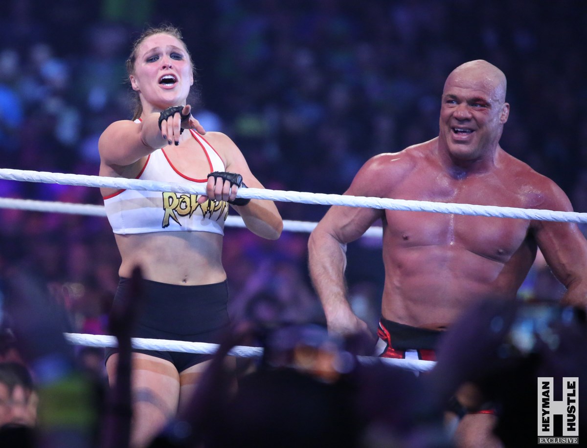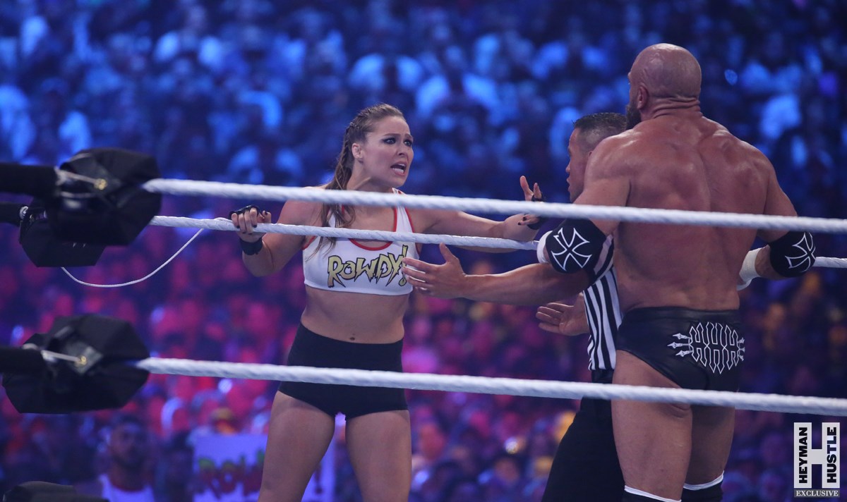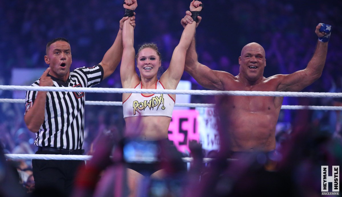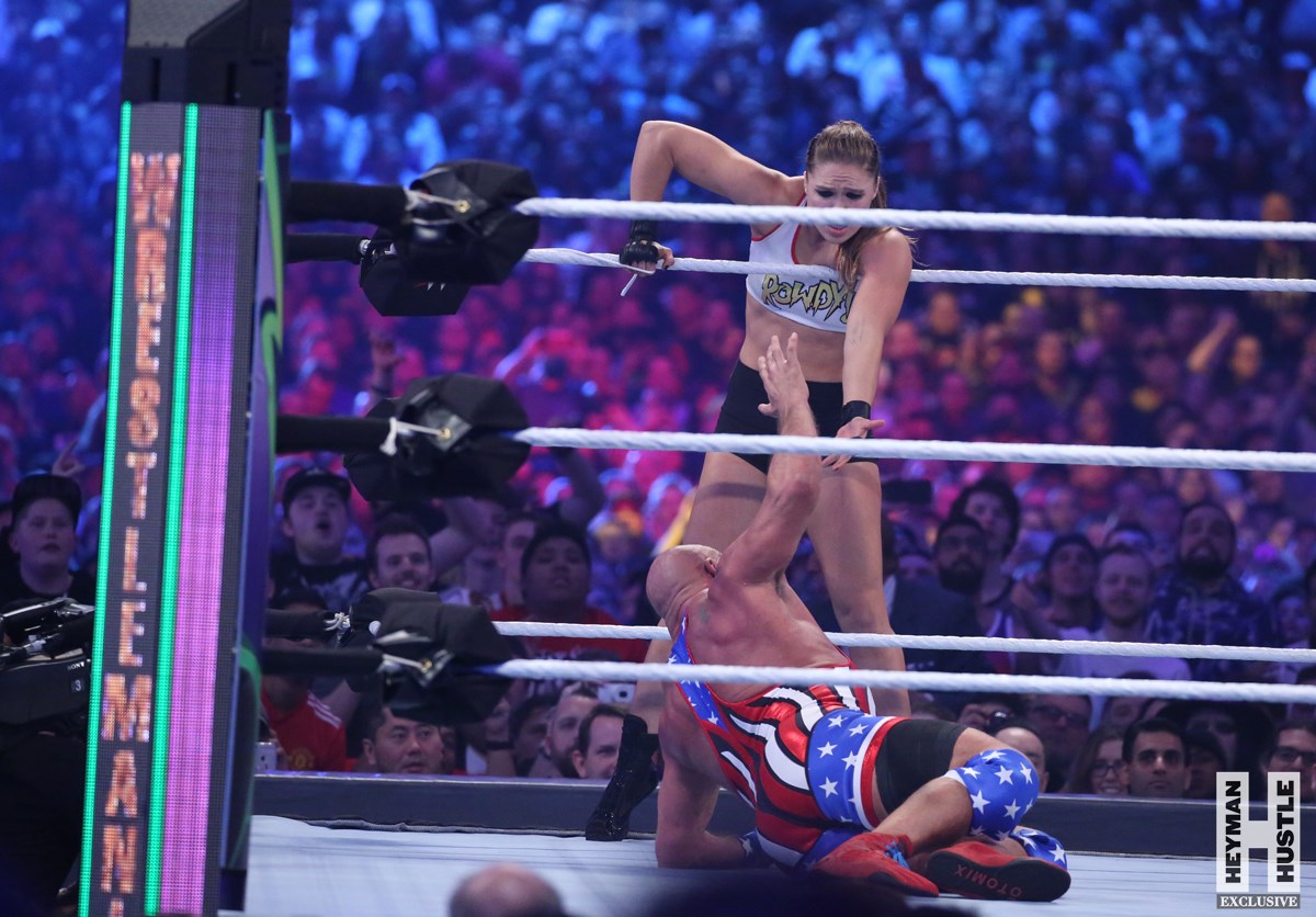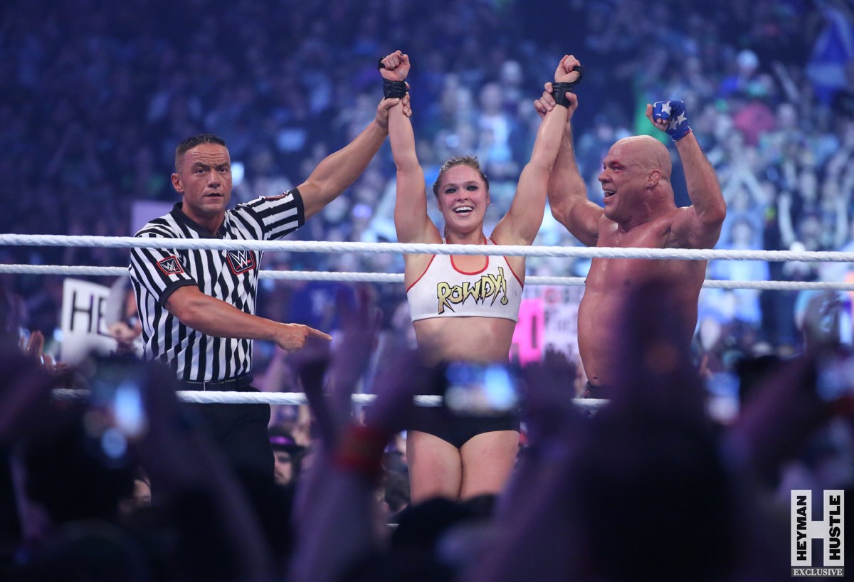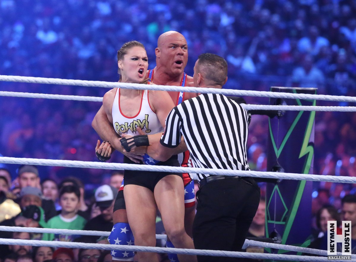 Rowdy Ronda Rousey has made her official in-ring debut for World Wrestling Entertainment, forcing RAW Commissioner Stephanie McMahon to tap out to … what else? … an arm bar in the match that many feel stole the entire show last night at WrestleMania 34. Rousey and fellow Olympian Kurt Angle triumphed over McMahon and WWE COO Triple H in an epic encounter for the ages. The Heyman Hustle‘s very own Bruno Silveira was on hand to provide EXCLUSIVE photo coverage of the historic event.