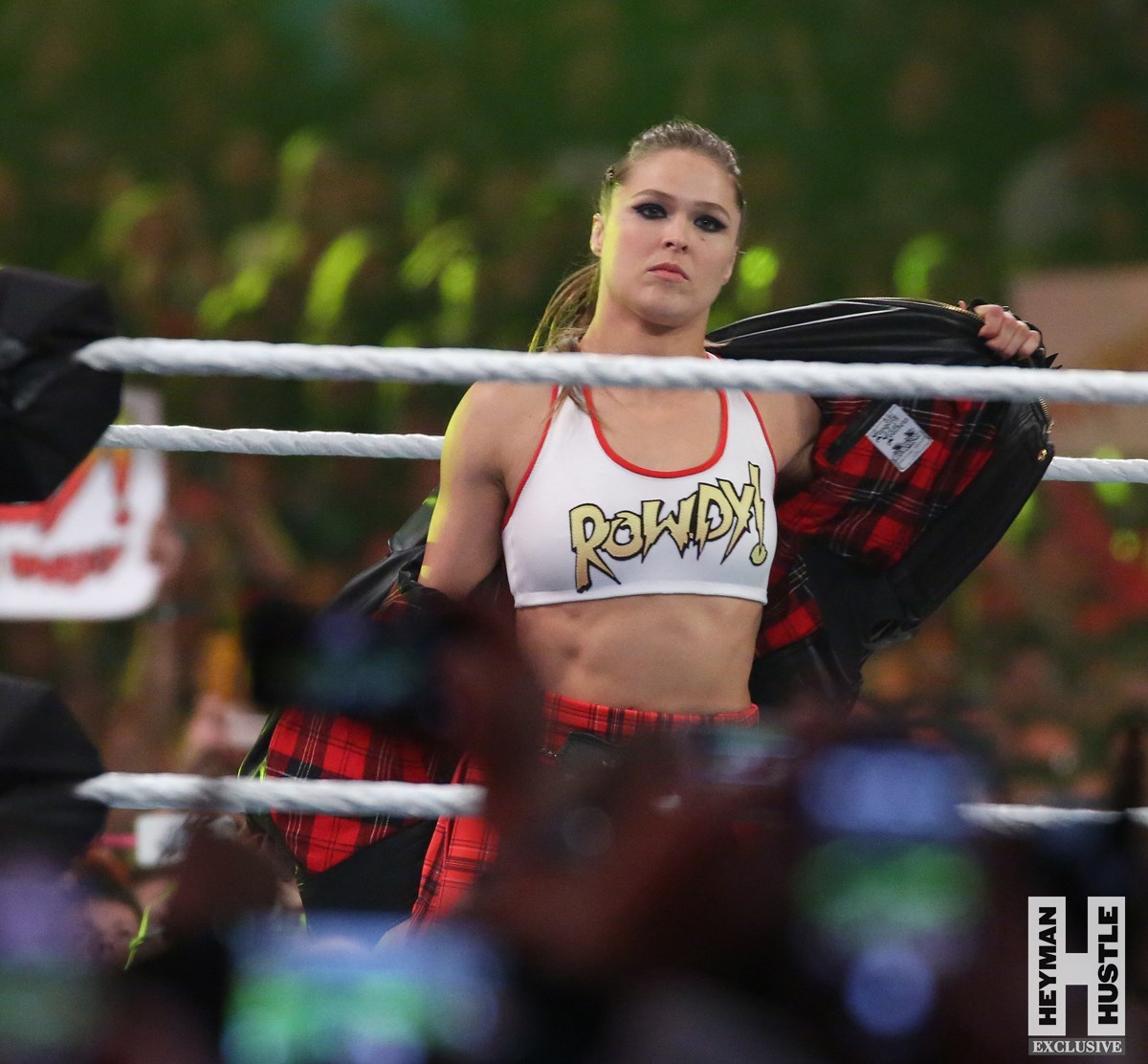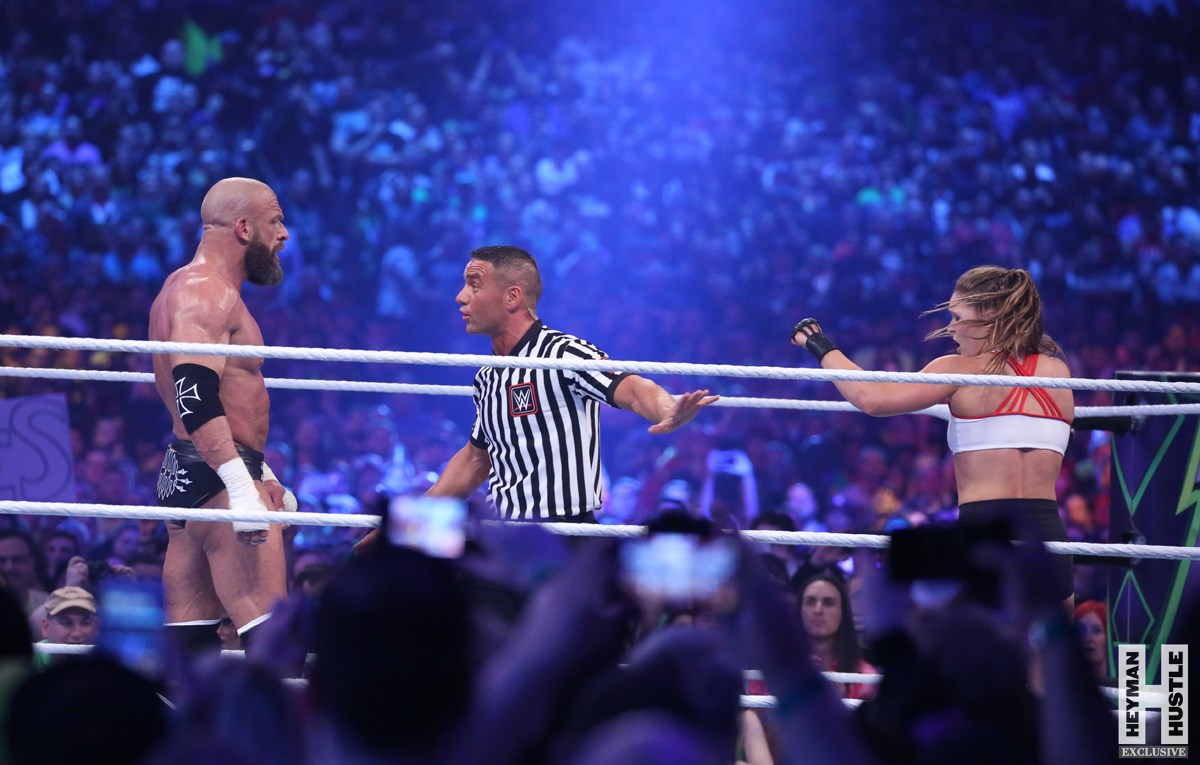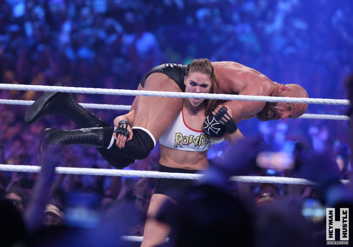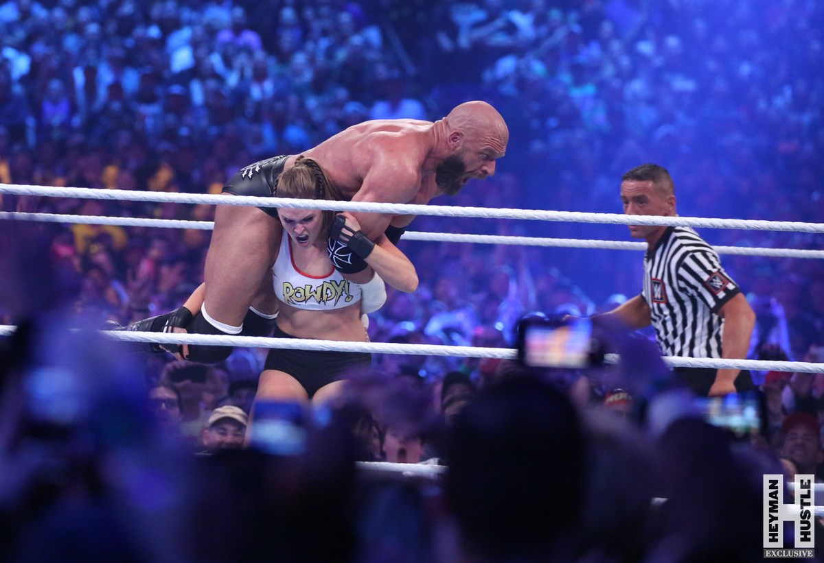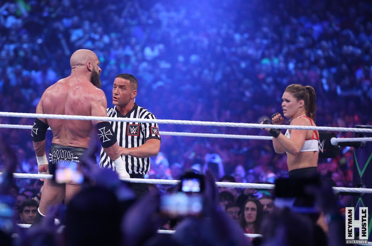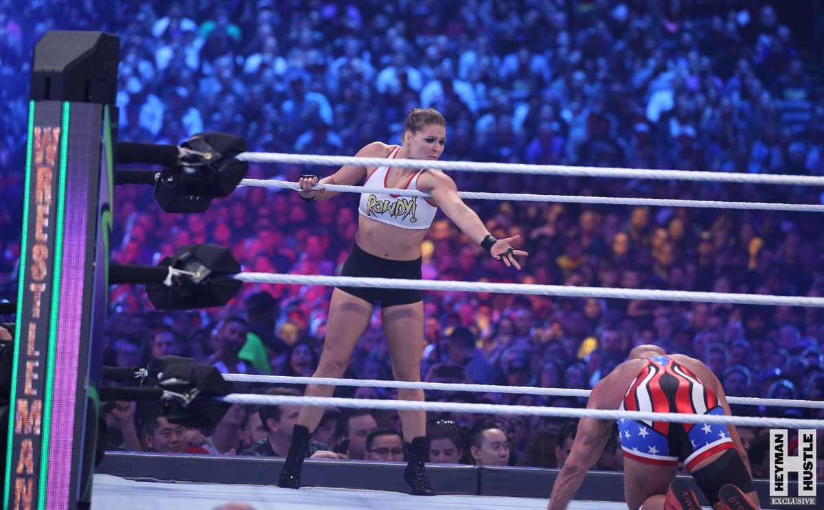 Rowdy Ronda Rousey has made her official in-ring debut for World Wrestling Entertainment, forcing RAW Commissioner Stephanie McMahon to tap out to … what else? … an arm bar in the match that many feel stole the entire show last night at WrestleMania 34. Rousey and fellow Olympian Kurt Angle triumphed over McMahon and WWE COO Triple H in an epic encounter for the ages. The Heyman Hustle‘s very own Bruno Silveira was on hand to provide EXCLUSIVE photo coverage of the historic event.