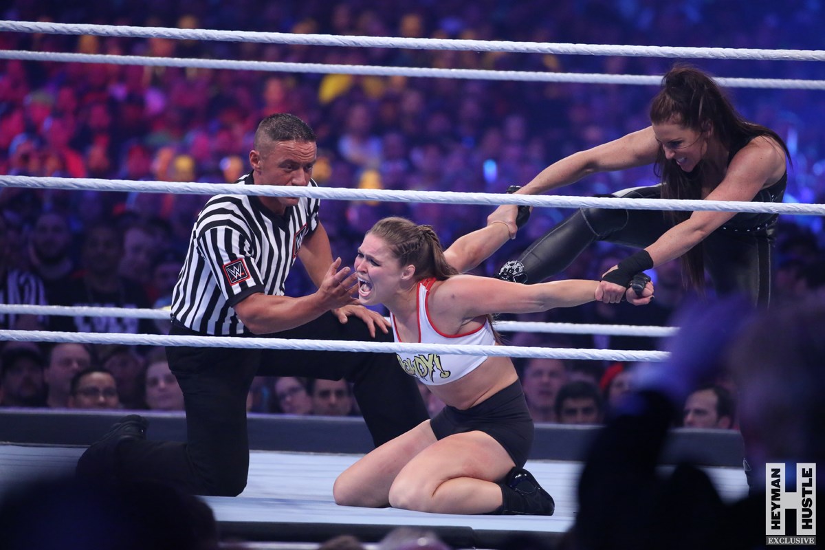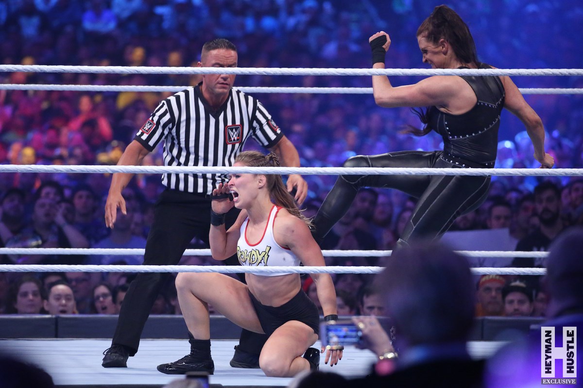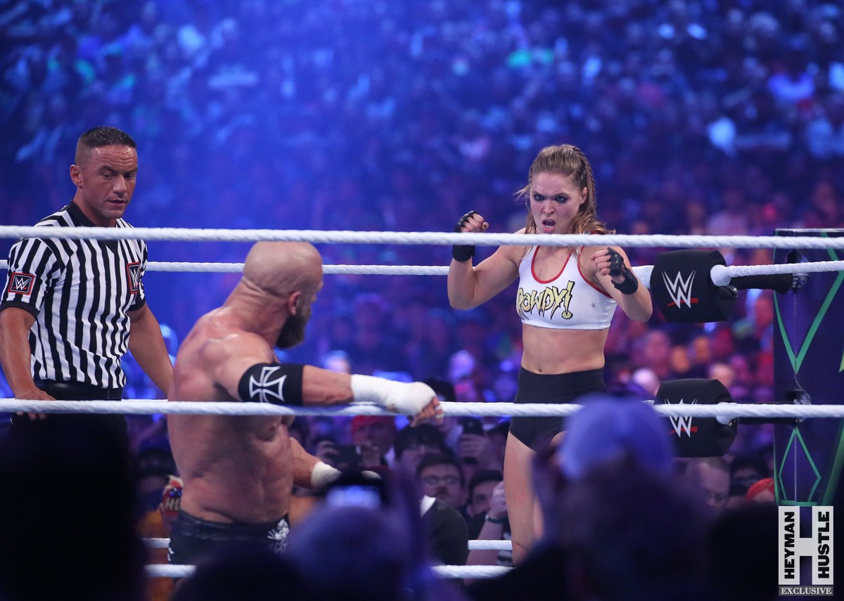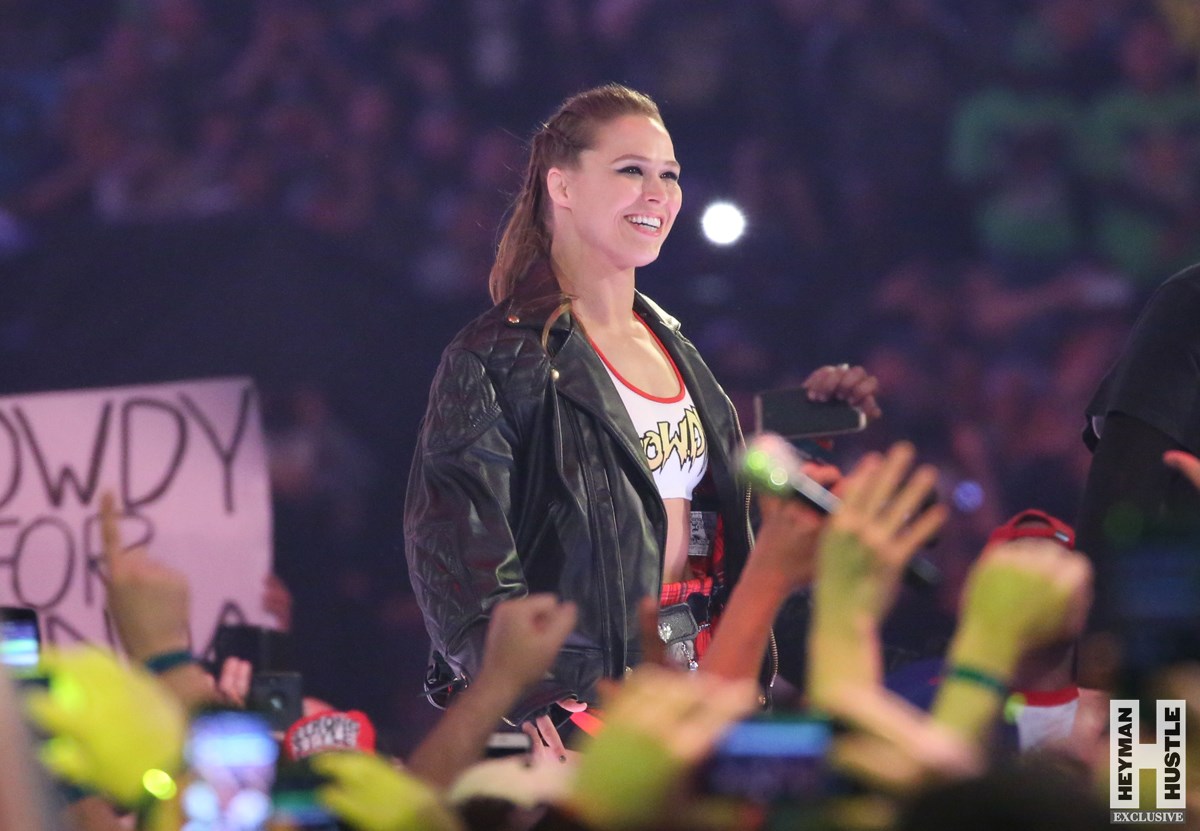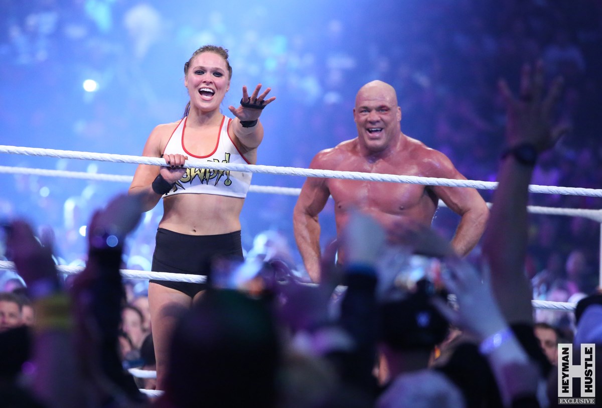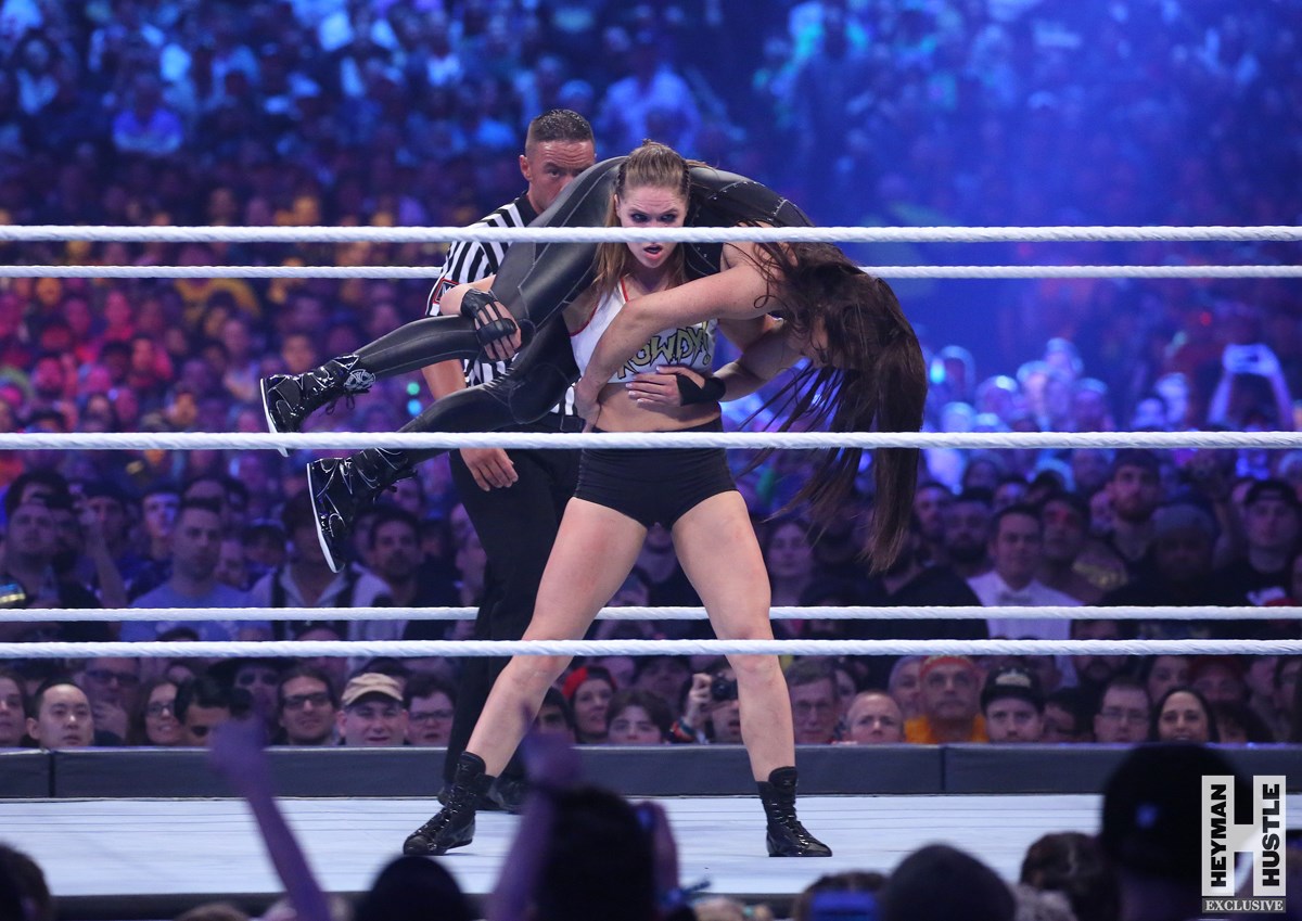 Rowdy Ronda Rousey has made her official in-ring debut for World Wrestling Entertainment, forcing RAW Commissioner Stephanie McMahon to tap out to … what else? … an arm bar in the match that many feel stole the entire show last night at WrestleMania 34. Rousey and fellow Olympian Kurt Angle triumphed over McMahon and WWE COO Triple H in an epic encounter for the ages. The Heyman Hustle‘s very own Bruno Silveira was on hand to provide EXCLUSIVE photo coverage of the historic event.