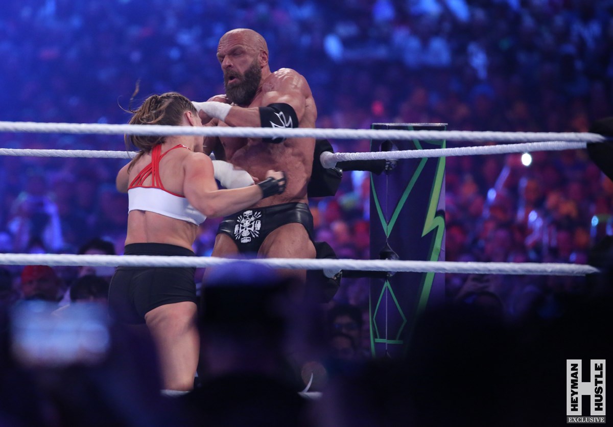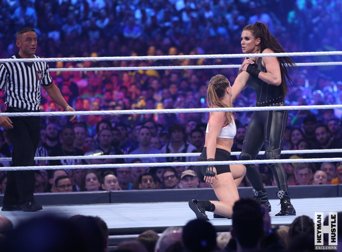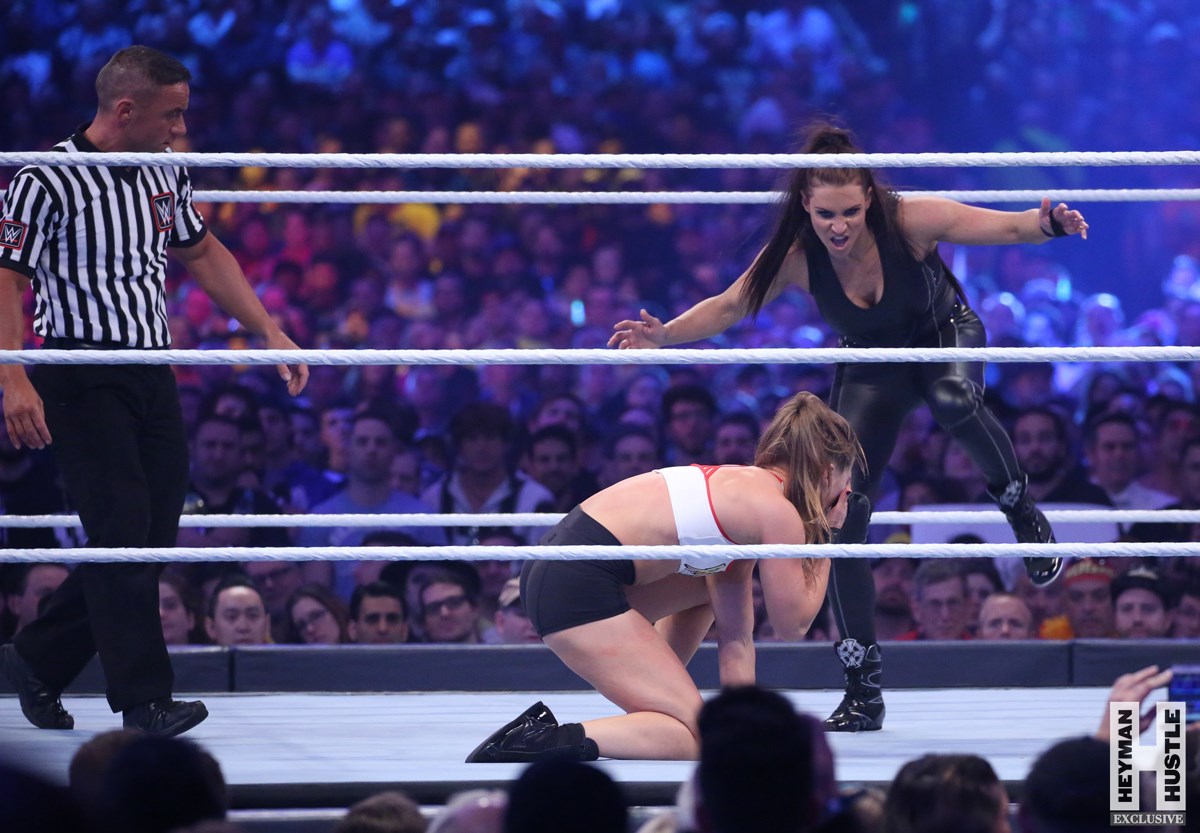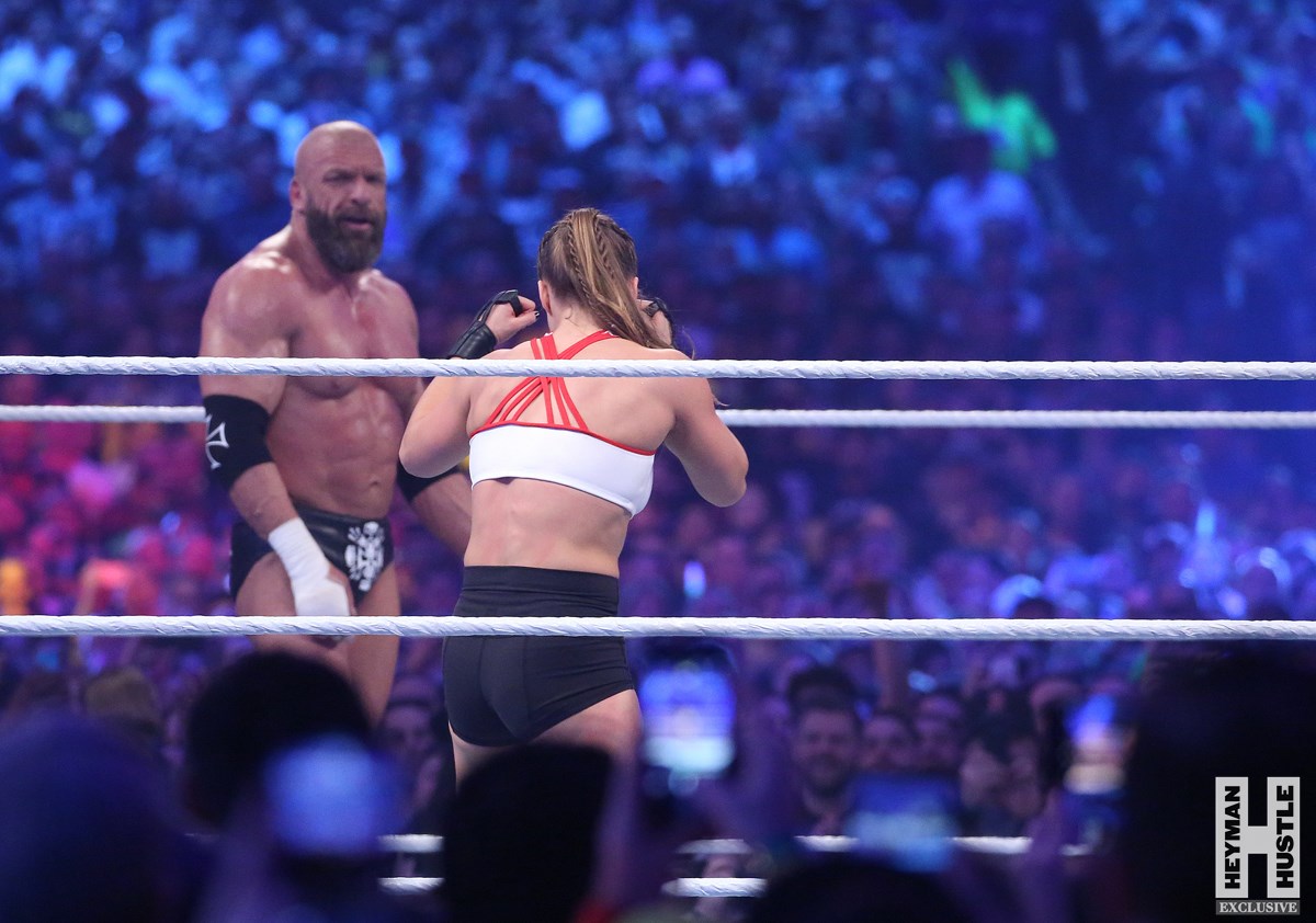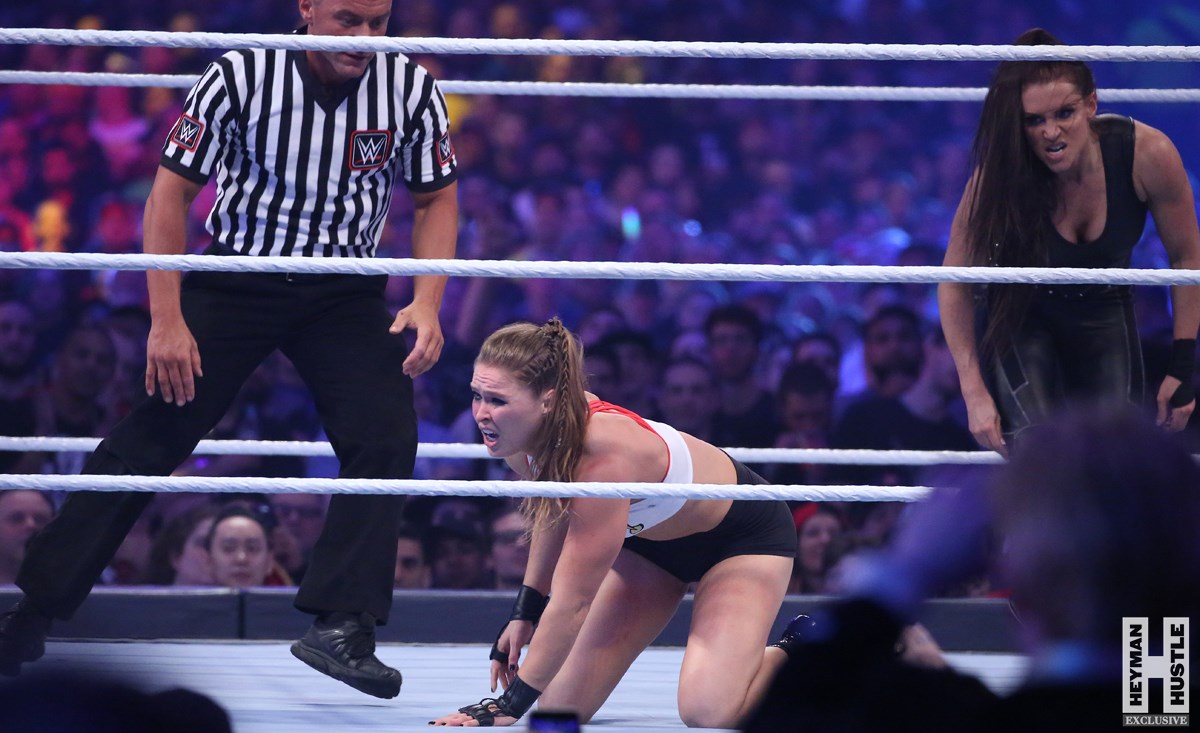 Rowdy Ronda Rousey has made her official in-ring debut for World Wrestling Entertainment, forcing RAW Commissioner Stephanie McMahon to tap out to … what else? … an arm bar in the match that many feel stole the entire show last night at WrestleMania 34. Rousey and fellow Olympian Kurt Angle triumphed over McMahon and WWE COO Triple H in an epic encounter for the ages. The Heyman Hustle‘s very own Bruno Silveira was on hand to provide EXCLUSIVE photo coverage of the historic event.