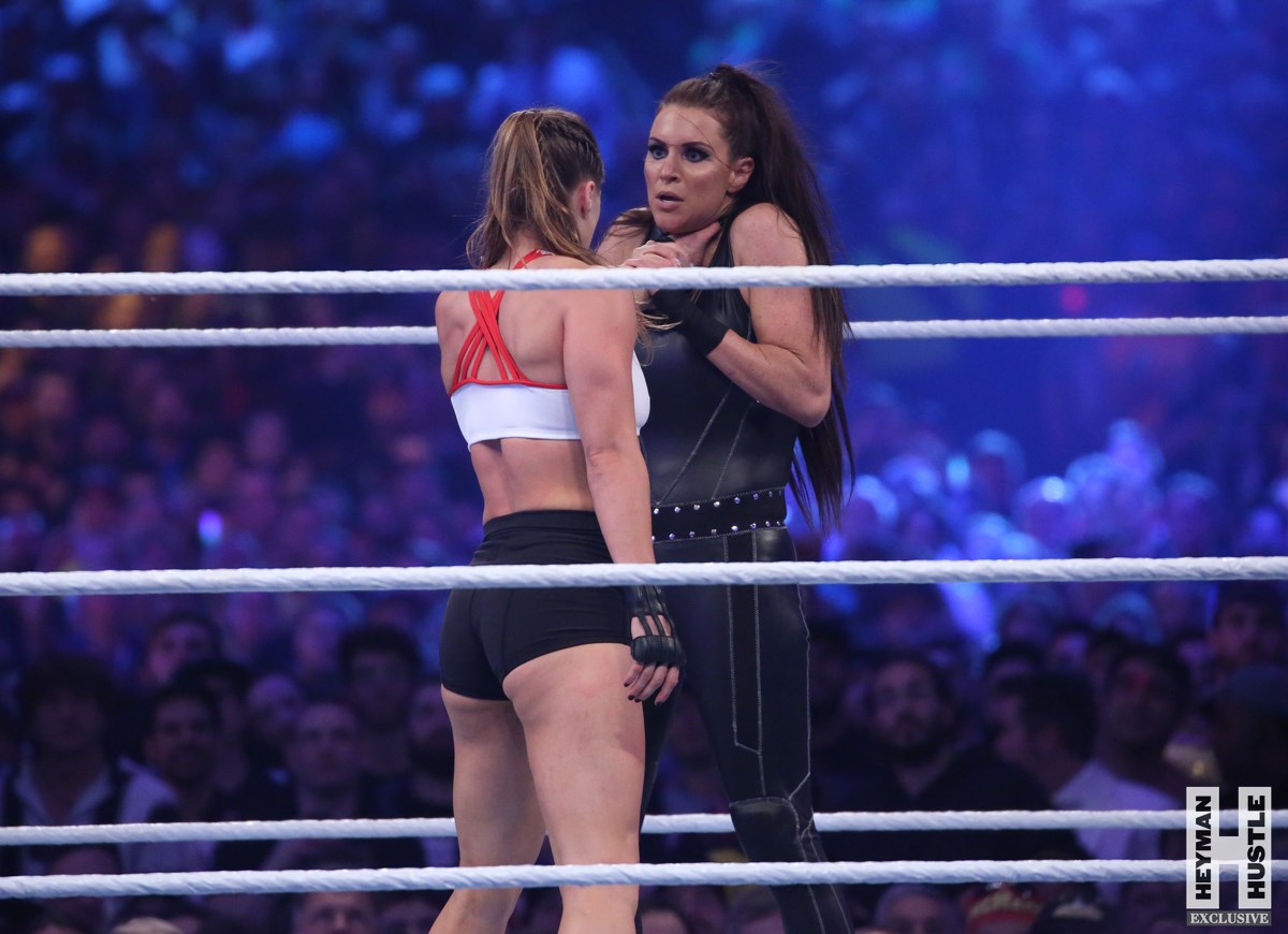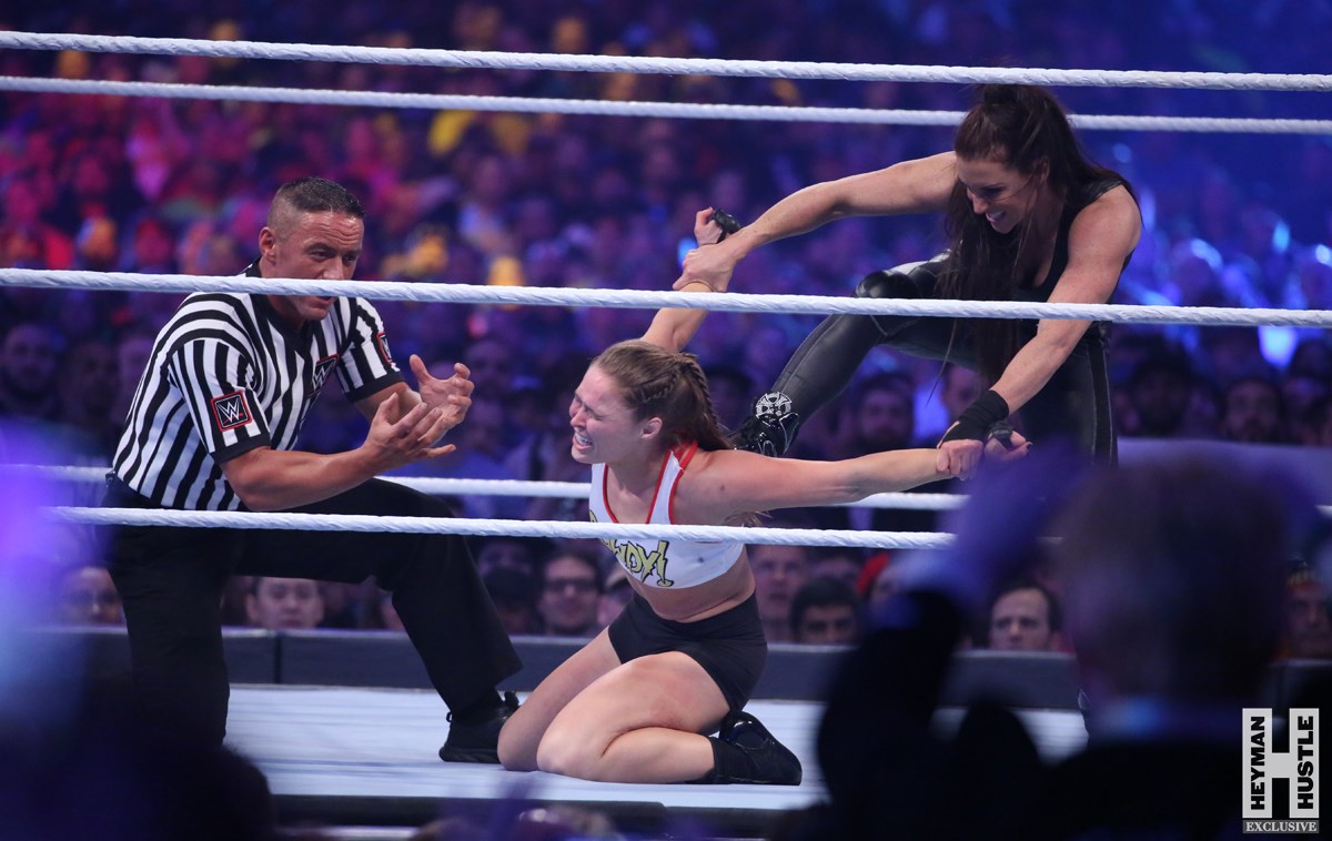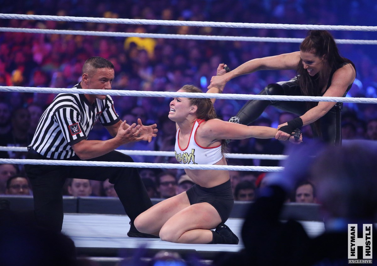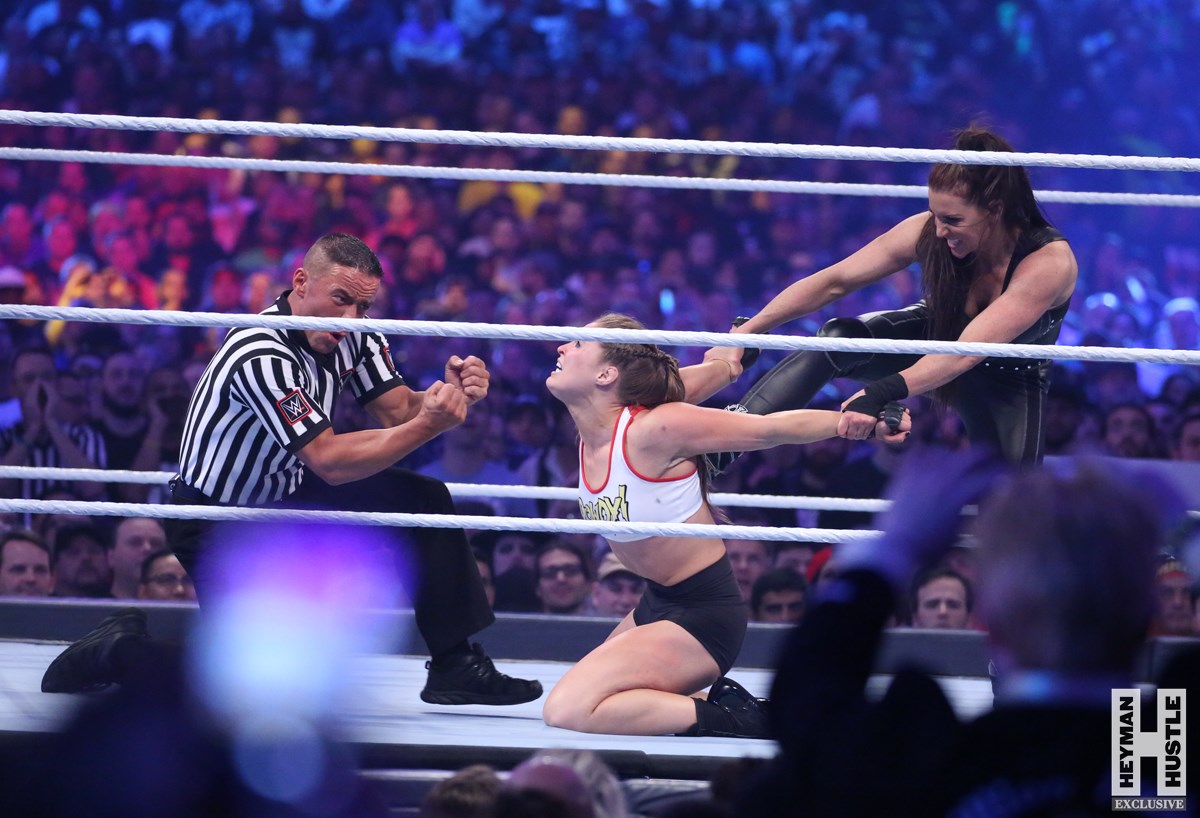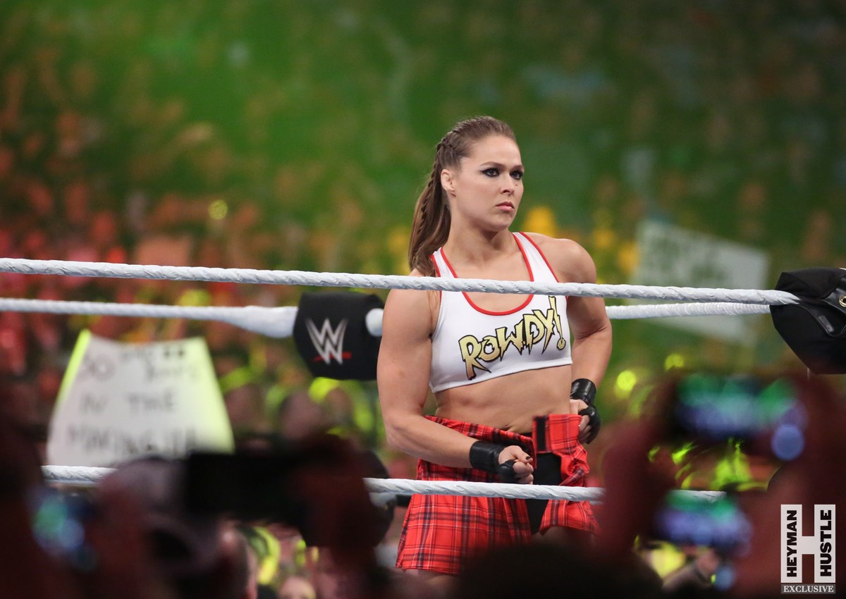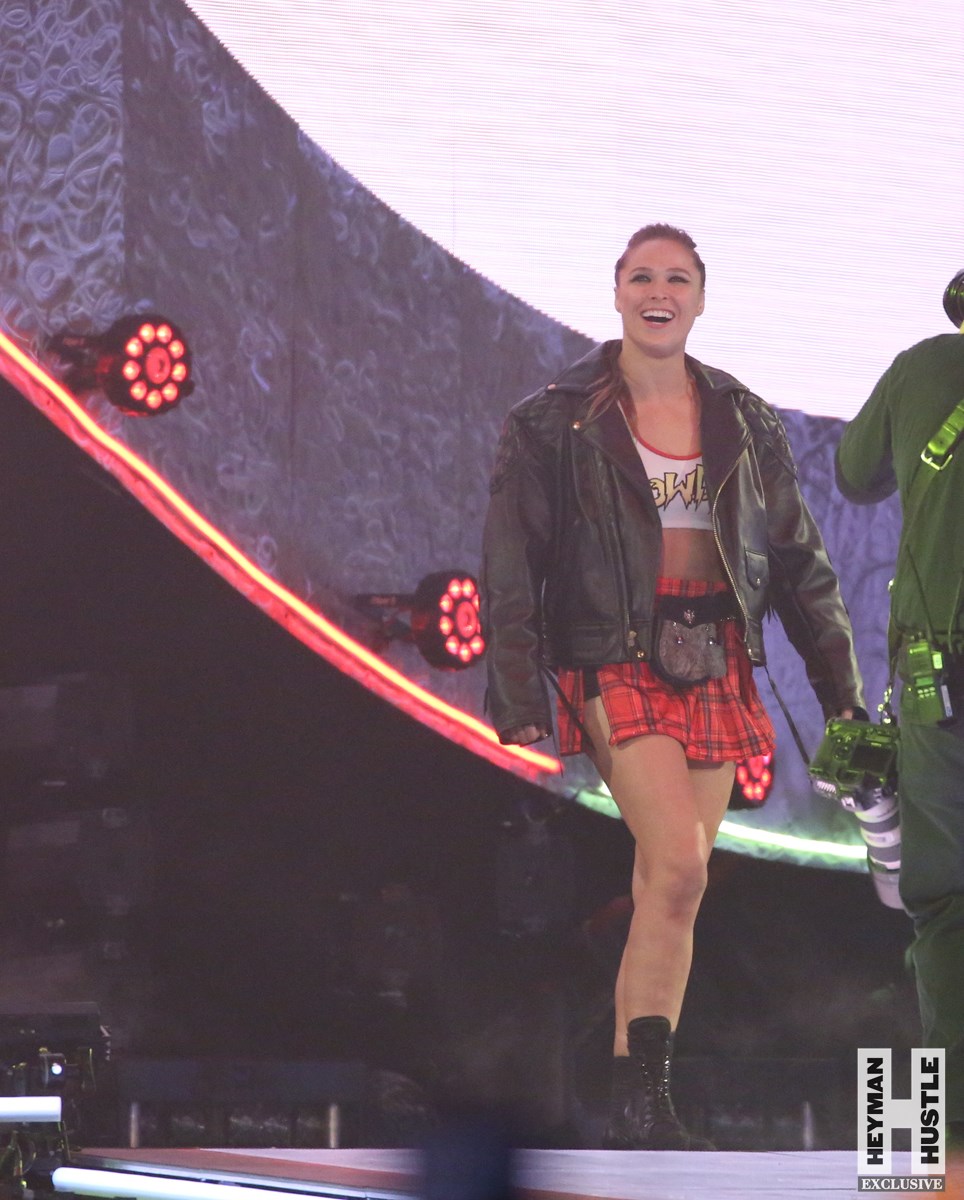 Rowdy Ronda Rousey has made her official in-ring debut for World Wrestling Entertainment, forcing RAW Commissioner Stephanie McMahon to tap out to … what else? … an arm bar in the match that many feel stole the entire show last night at WrestleMania 34. Rousey and fellow Olympian Kurt Angle triumphed over McMahon and WWE COO Triple H in an epic encounter for the ages. The Heyman Hustle‘s very own Bruno Silveira was on hand to provide EXCLUSIVE photo coverage of the historic event.