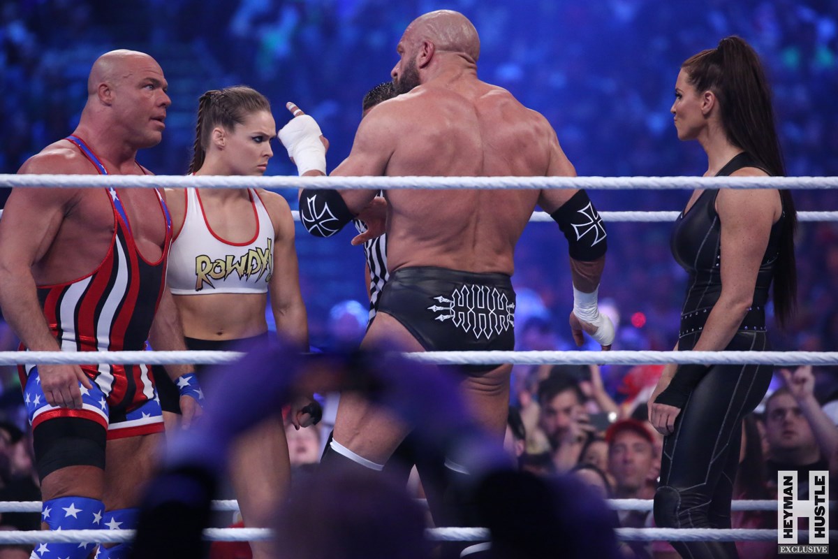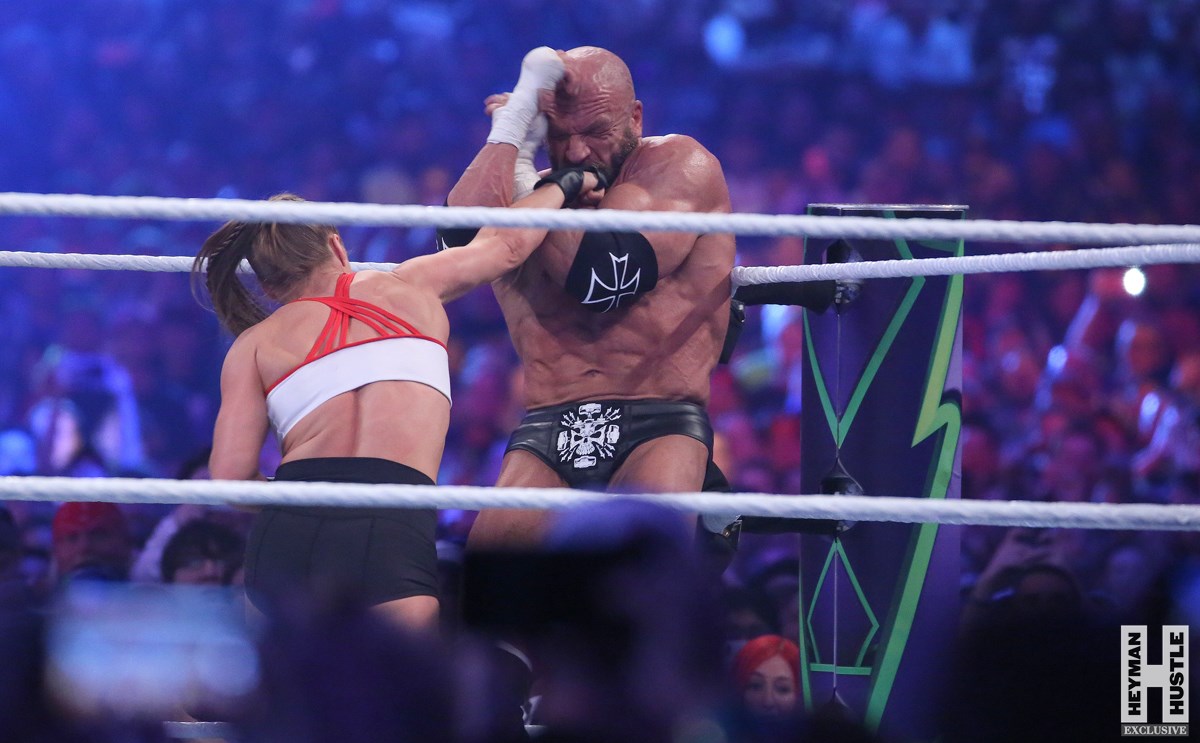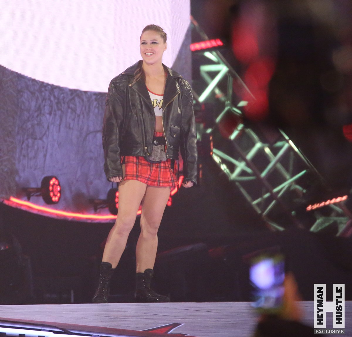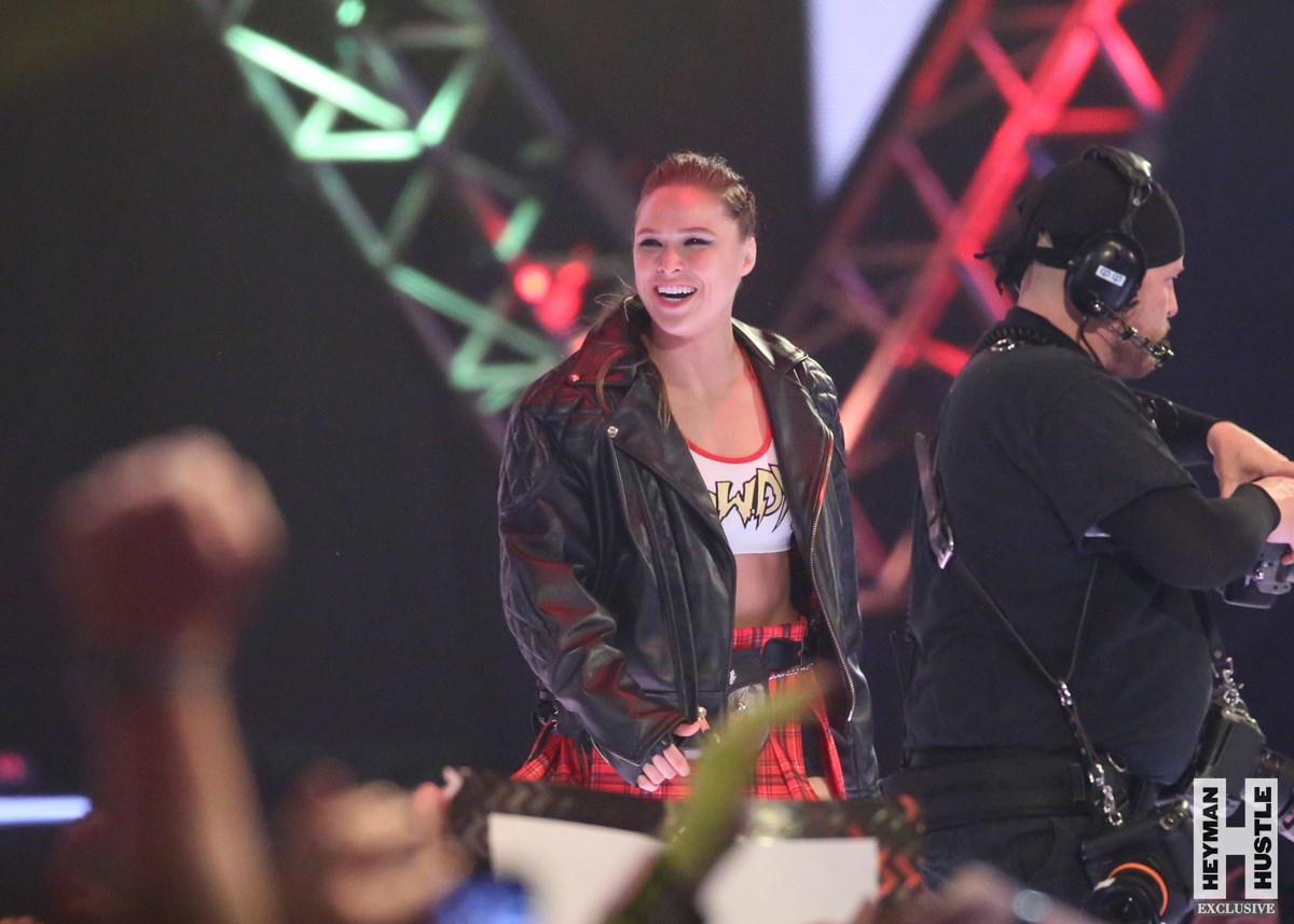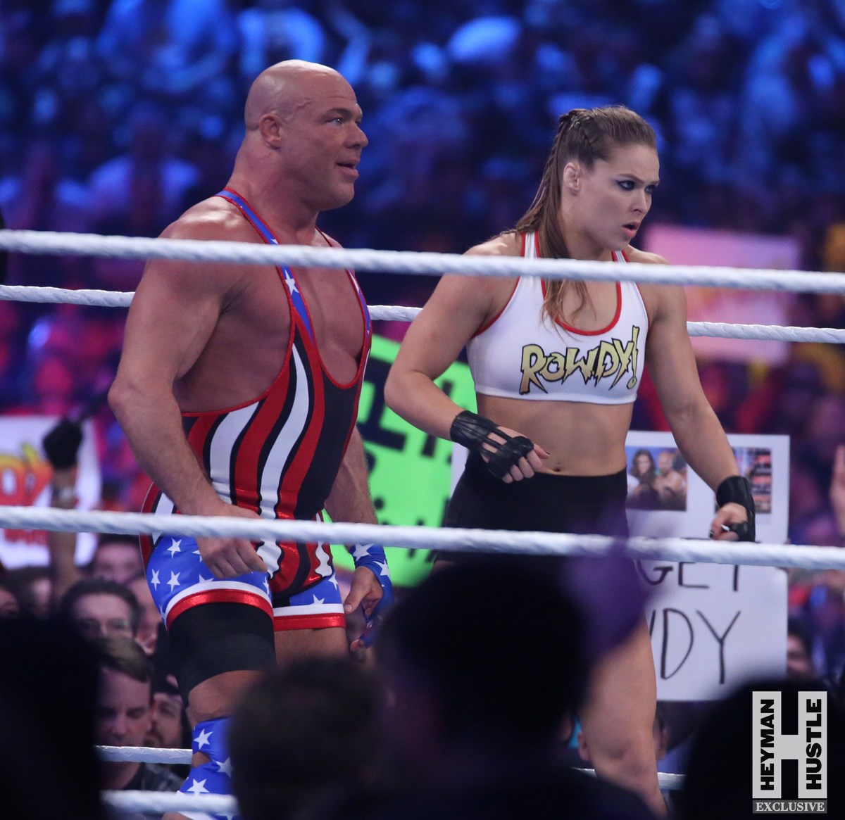 Rowdy Ronda Rousey has made her official in-ring debut for World Wrestling Entertainment, forcing RAW Commissioner Stephanie McMahon to tap out to … what else? … an arm bar in the match that many feel stole the entire show last night at WrestleMania 34. Rousey and fellow Olympian Kurt Angle triumphed over McMahon and WWE COO Triple H in an epic encounter for the ages. The Heyman Hustle‘s very own Bruno Silveira was on hand to provide EXCLUSIVE photo coverage of the historic event.