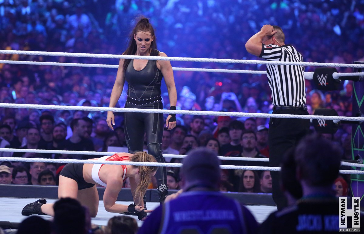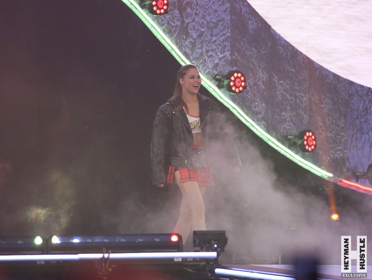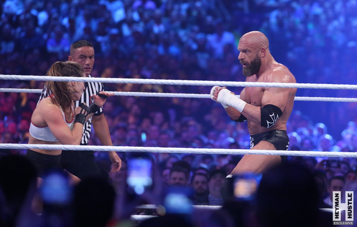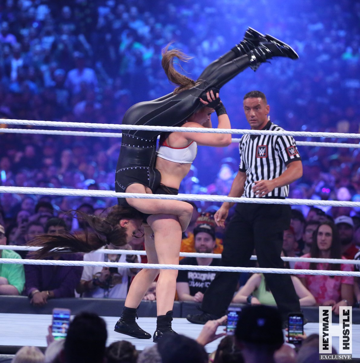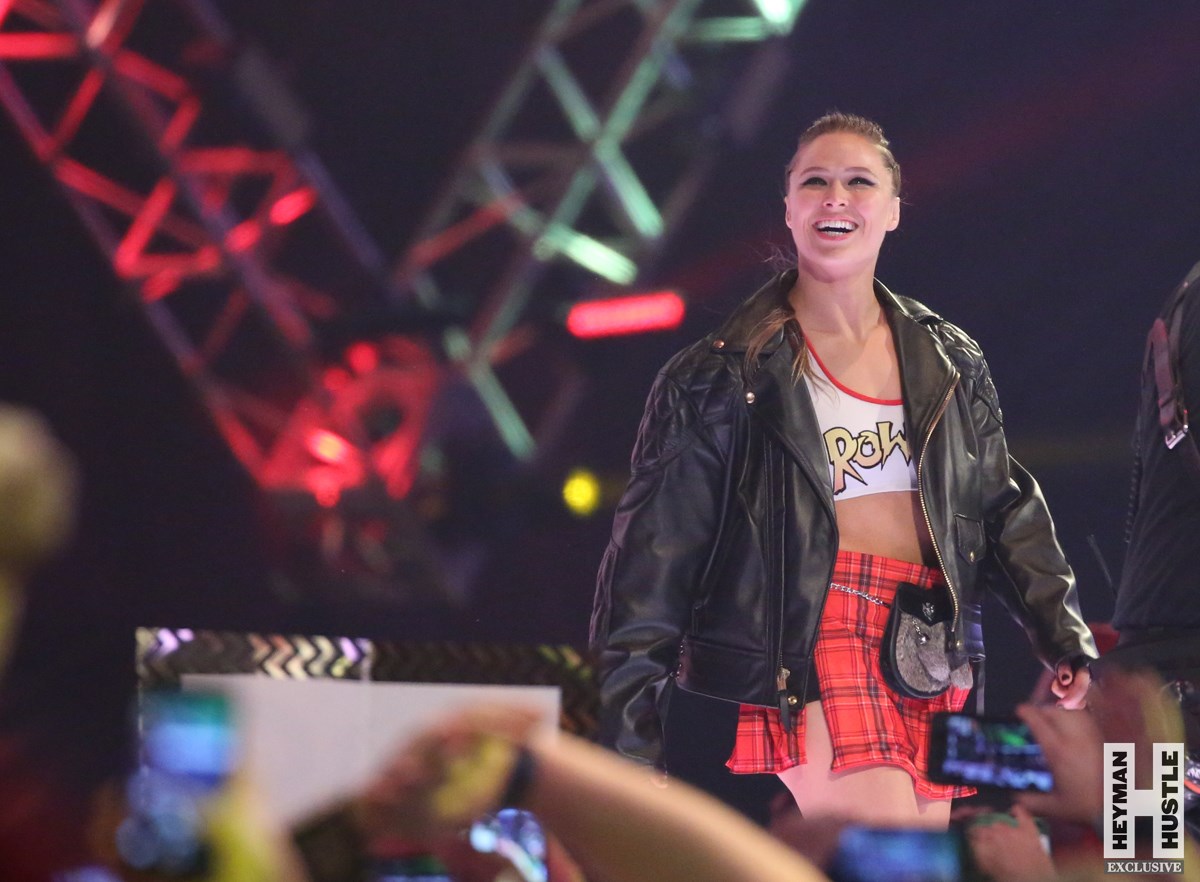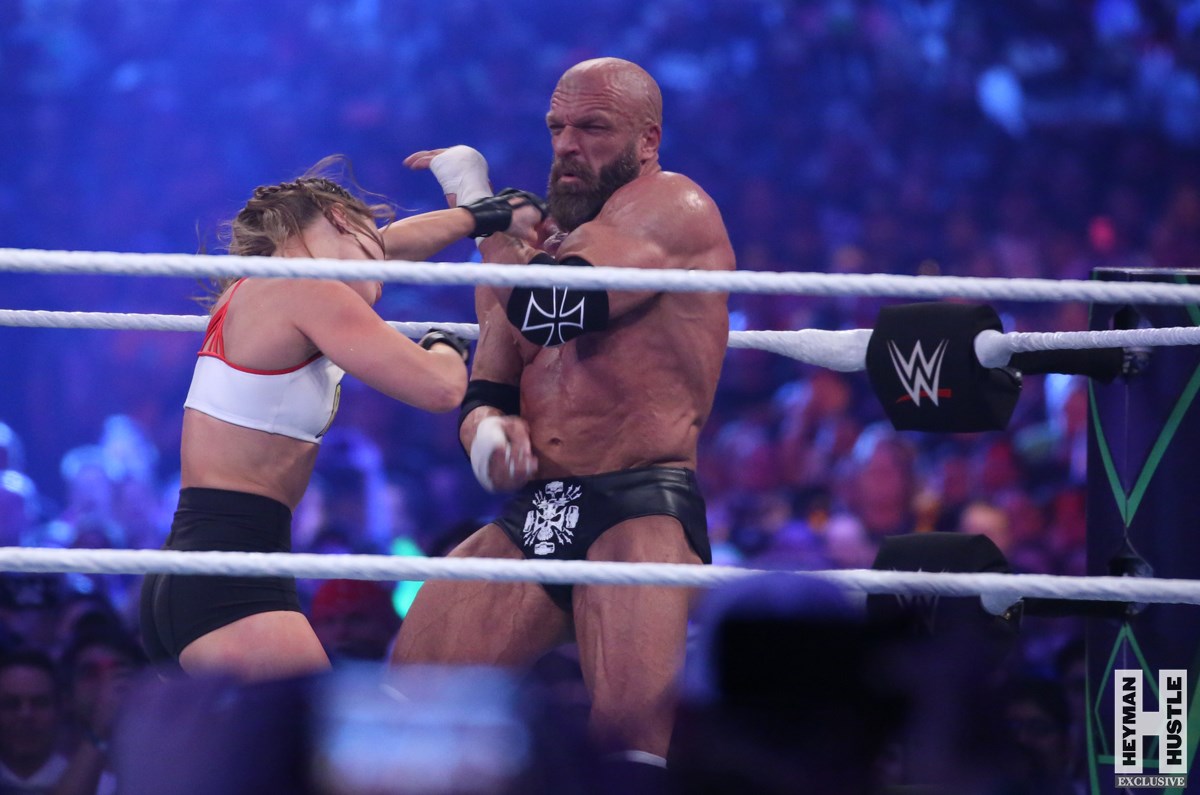 Rowdy Ronda Rousey has made her official in-ring debut for World Wrestling Entertainment, forcing RAW Commissioner Stephanie McMahon to tap out to … what else? … an arm bar in the match that many feel stole the entire show last night at WrestleMania 34. Rousey and fellow Olympian Kurt Angle triumphed over McMahon and WWE COO Triple H in an epic encounter for the ages. The Heyman Hustle‘s very own Bruno Silveira was on hand to provide EXCLUSIVE photo coverage of the historic event.